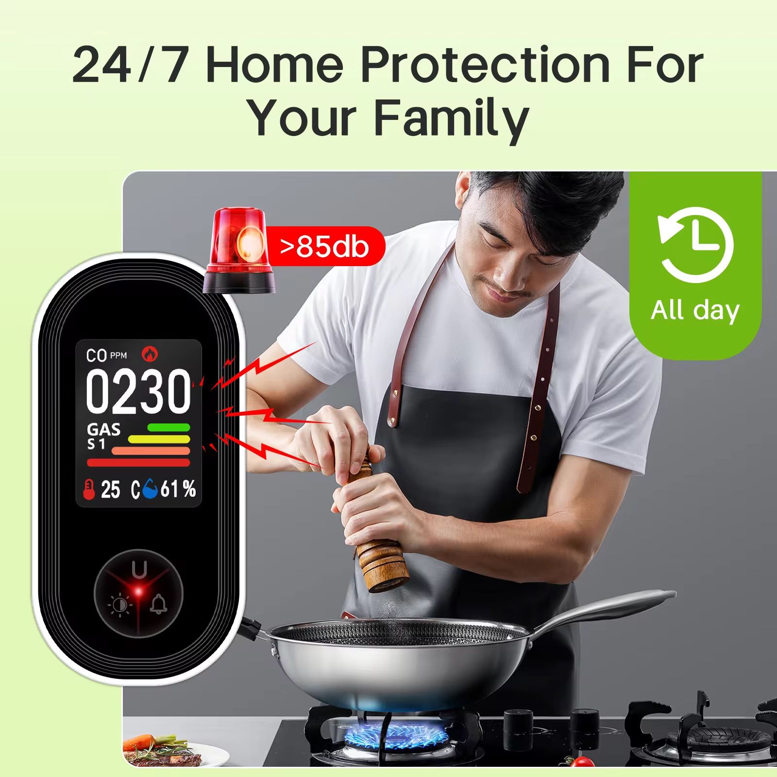 Este detector de monóxido de carbono usa sensores eletroquímicos para obter monitoramento de alta precisão na faixa de 0-999 ppm, com um tempo de resposta de menos de 2 segundos. É equipado com uma tela LCD colorida que pode exibir temperatura e umidade simultaneamente e também suporta rotação da tela. Ele também possui 4 níveis de alarmes sonoros e visuais: uma luz verde indica segurança sem alarme para 0-50 ppm; uma luz amarela pisca lentamente e emite um alarme leve para 51-100 ppm; uma luz laranja pisca rapidamente e soa um alarme para 101-150 ppm; uma luz vermelha pisca rapidamente e emite um alarme urgente para 150-999 ppm, com um nível de som superior a 85 dB. De casa para o carro, oferece proteção 24 horas por dia, usando desempenho profissional para construir uma barreira de segurança, permitindo que você sempre monitore as condições ambientais e proteja a saúde e a segurança de sua família.