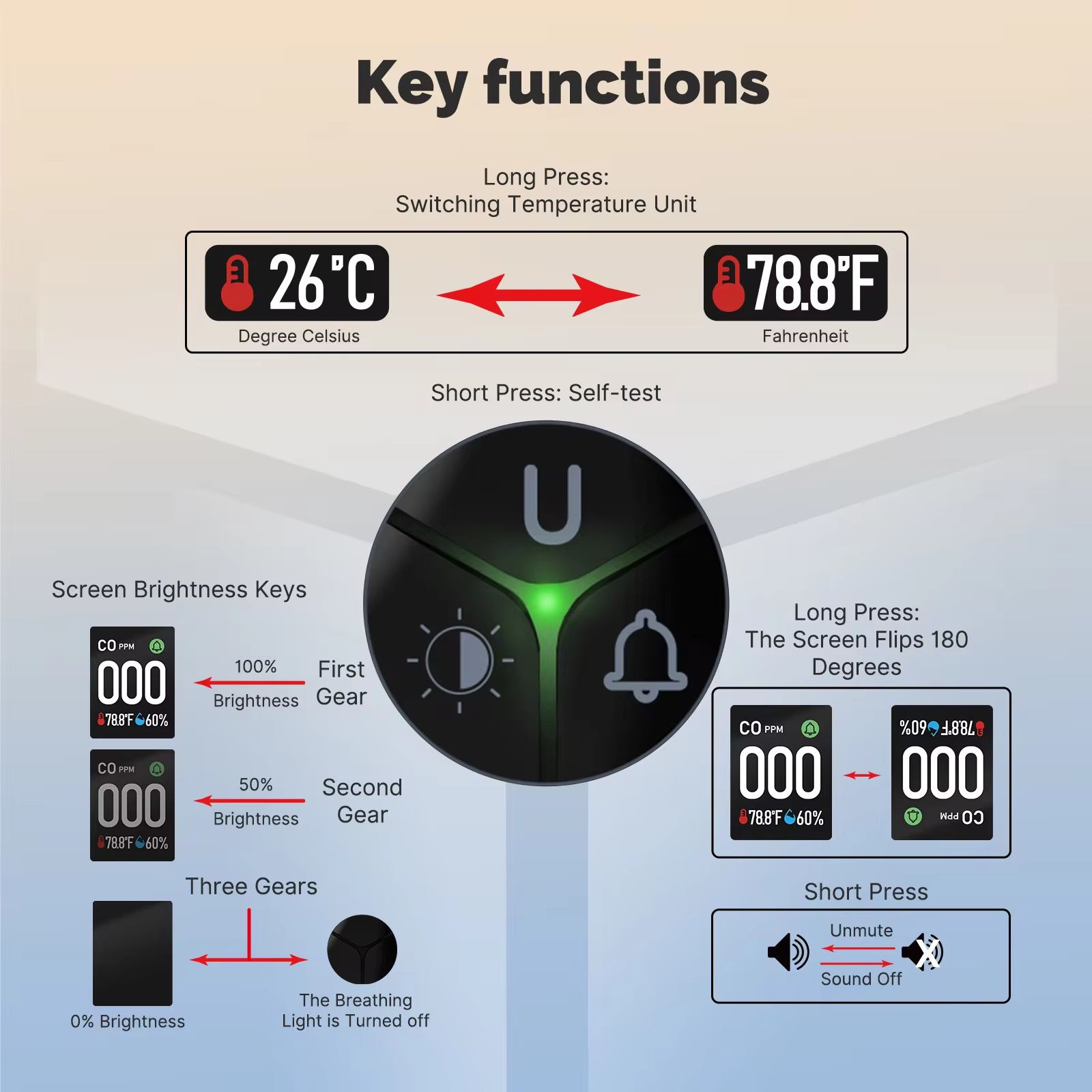 É equipado com um sensor altamente sensível, que pode monitorar com precisão a concentração de monóxido de carbono no ambiente e exibir o valor em tempo real. É equipado com uma tela de alta definição de 2 polegadas, apresentando os níveis de concentração em quatro cores: "Perigo (vermelho), Aviso (laranja), Atenção (amarelo), Bom (verde)". As mudanças na concentração são claras à primeira vista. Ao mesmo tempo, é definido com 4 níveis de alarmes sonoros e visuais. Quando a concentração de CO excede o padrão, o som de alarme penetrante e as luzes atraentes darão um lembrete duplo, mesmo durante o sono, permitindo que você seja acordado a tempo e ganhe tempo crucial para escapar.