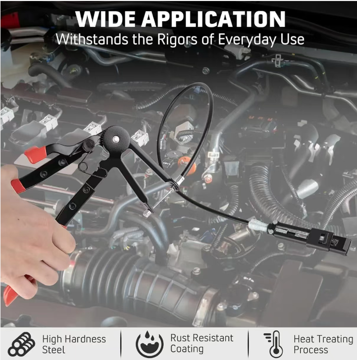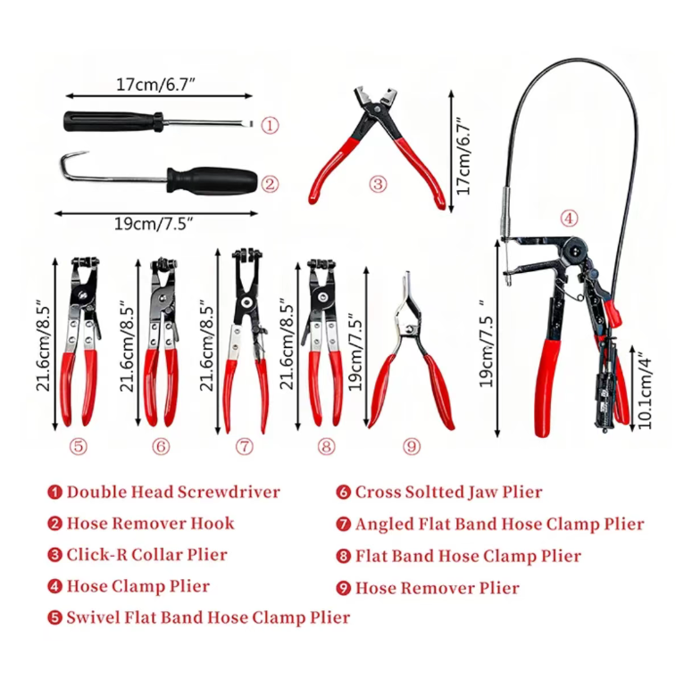 Ele cobre todos os cenários com suas 9 ferramentas principais: alicate de correia plana, alicate de braçadeira de mangueira, alicate flexível de longa distância, etc., em várias formas, adequados para grampos de diferentes posições - o grampo de mangueira no compartimento do motor? Use o alicate flexível com um cabo de extensão, e o ângulo de flexão é precisamente "alcançável"; A teimosa grampa plana da correia? Os alicates especiais podem ser apertados e liberados com um único movimento, dizendo adeus à desmontagem violenta que danifica os canos.