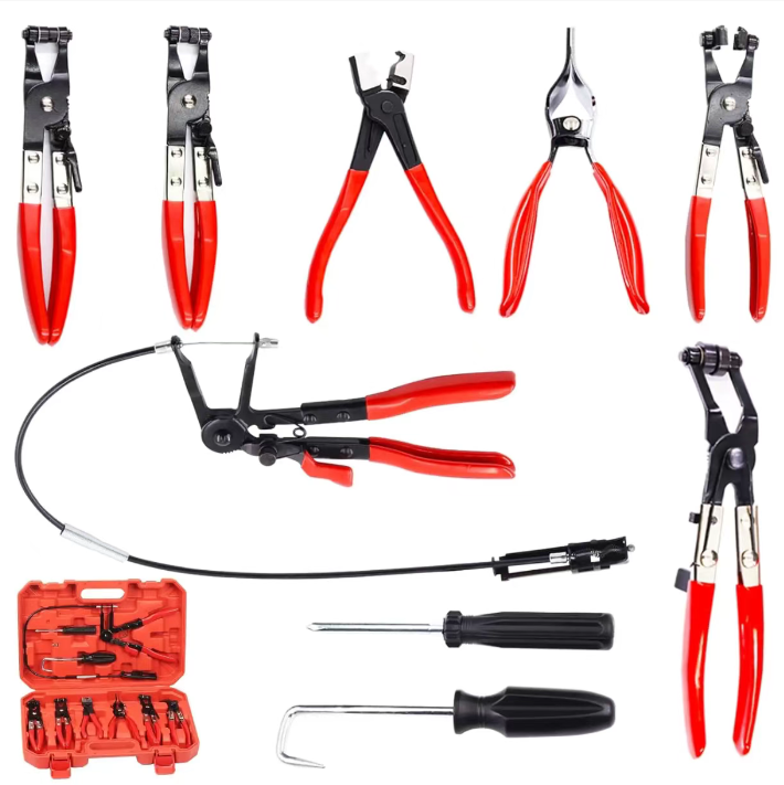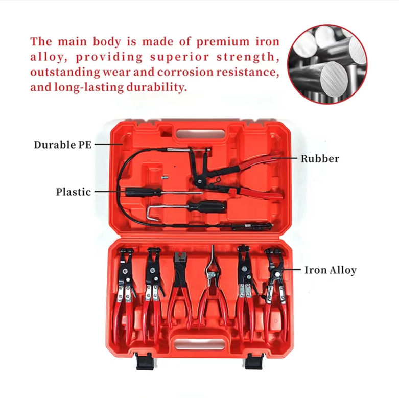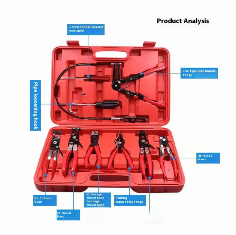 Ao manter ou consertar veículos, o problema mais problemático é a dificuldade de remover os grampos dos canos e a impossibilidade de alcançar as mangueiras flexíveis. Este kit de 9 ferramentas para veículos é realmente um "deus da eficiência" para mecânicos automotivos, fornecendo todos os alicates necessários para a manutenção de canos de carros e motocicletas em um único pacote!