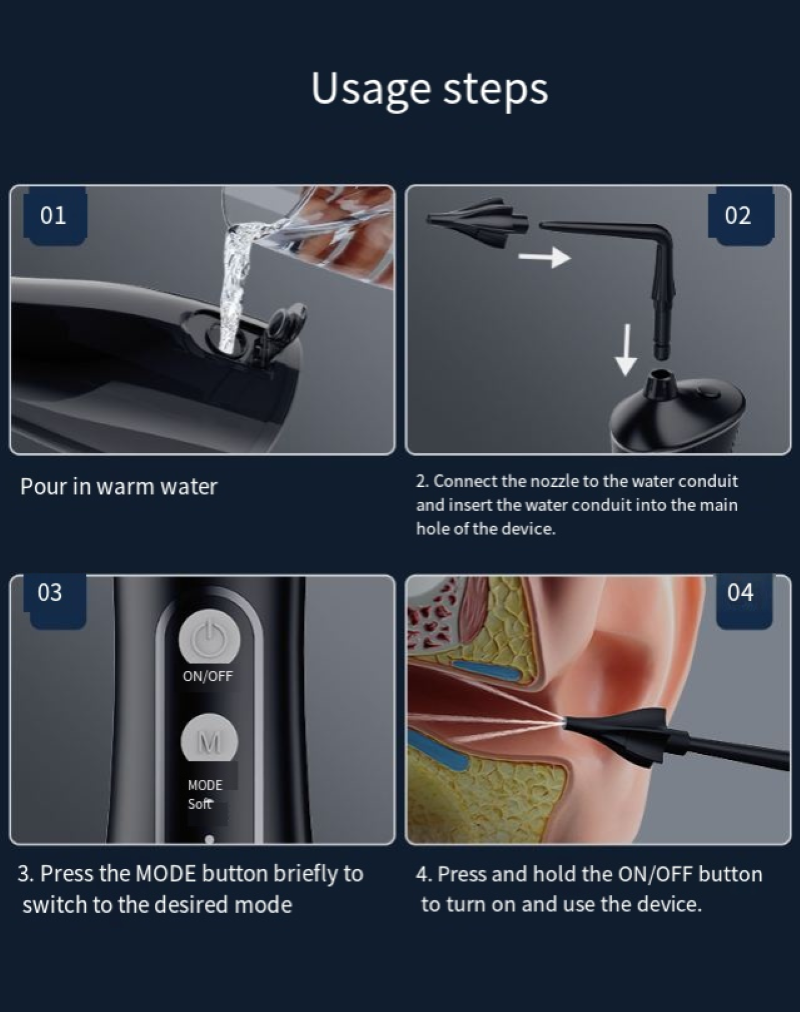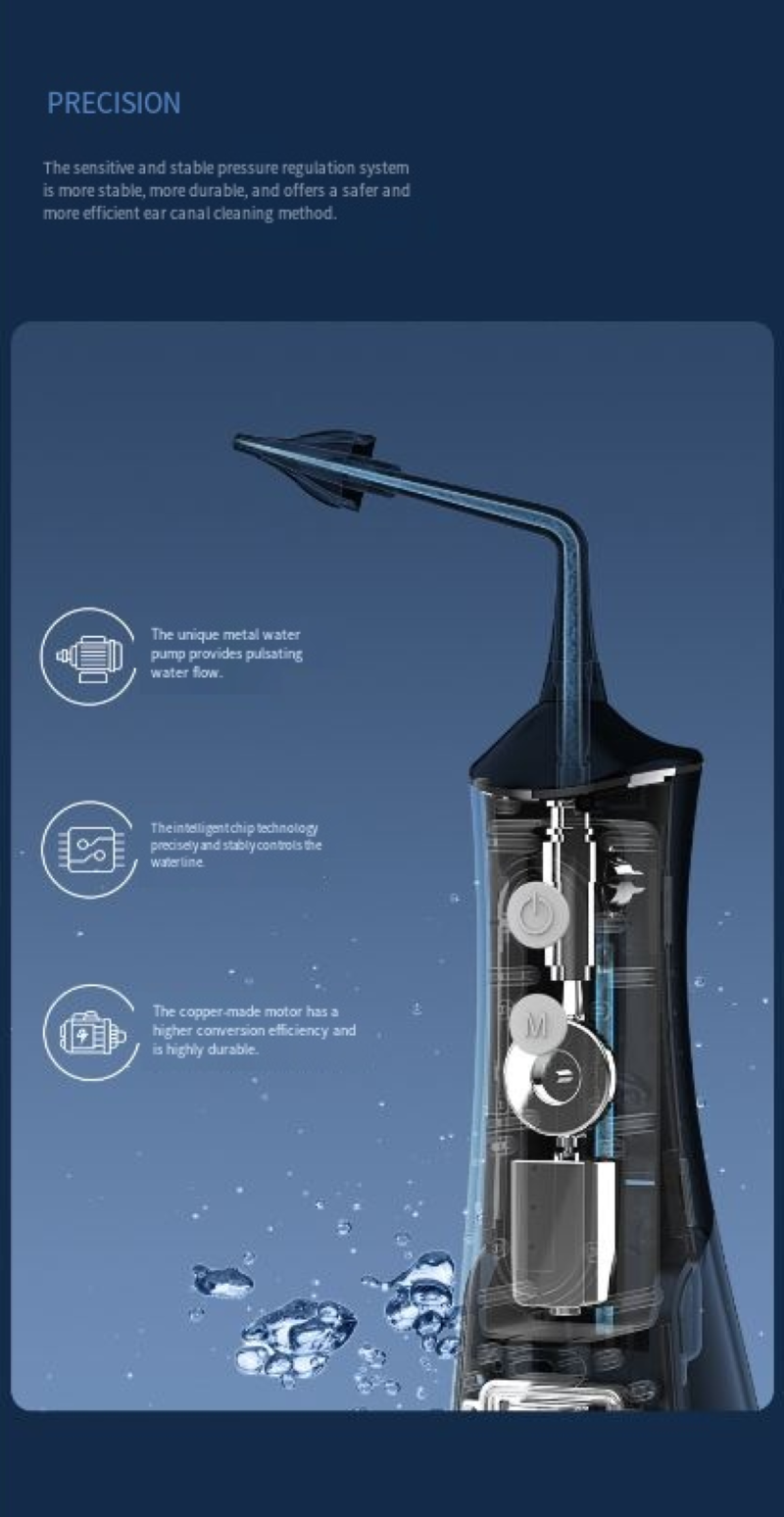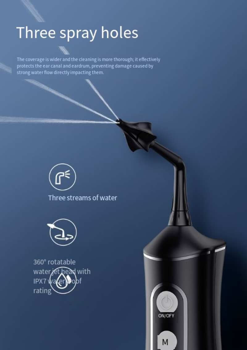 Comparado ao "cutucar as orelhas do cotonete": o cotonete empurra a cera para mais fundo. Ele utiliza uma ponta auricular de três furos / um furo para limpeza precisa – a ponta de três furos envolve o canal auditivo em todas as direções, e a água flui uniformemente para limpar os pontos cegos; A ponta de orelha de um único orifício possui fluxo concentrado de água, que pode dispersar suavemente a cera teimosa sem arranhar a mucosa do canal auditivo.