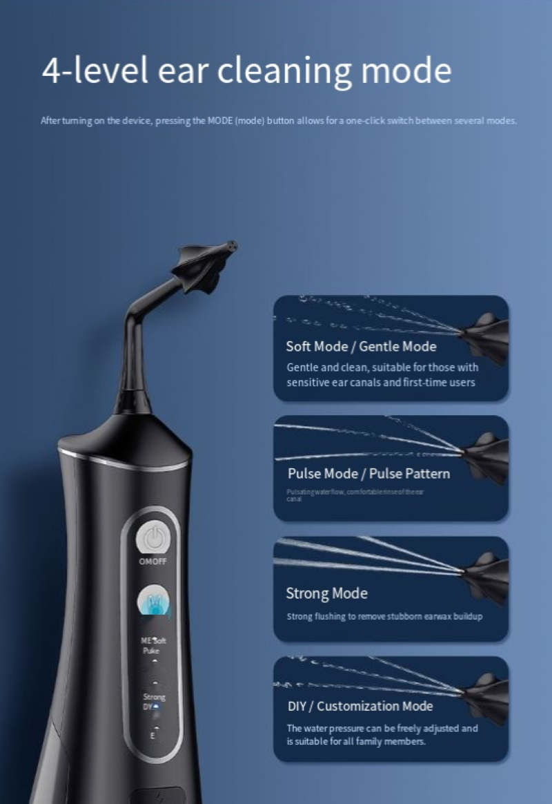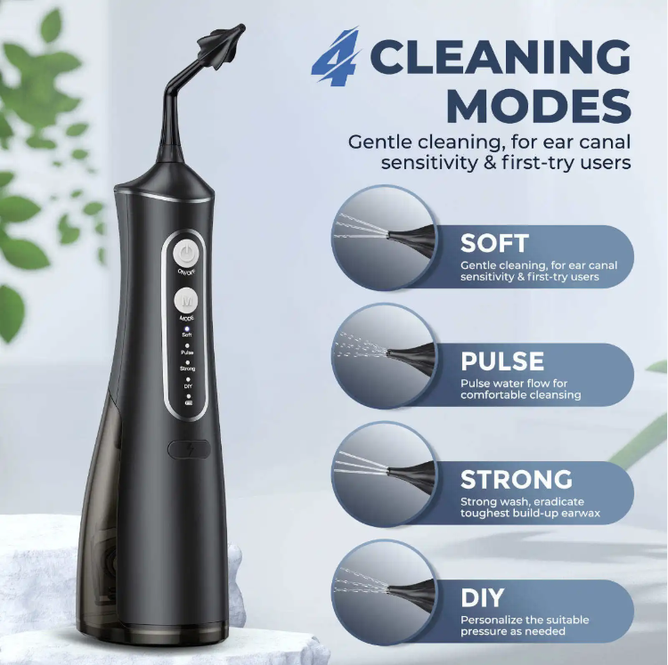 Modo suave e suave: O fluxo de água é suave, adequado para pessoas sensíveis ao canal auditivo, crianças ou usuários de primeira viagem, limpando enquanto protege o canal auditivo;