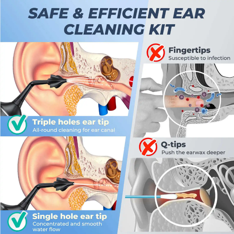 Comparado à "limpeza das orelhas dos dedos": é propenso a bactérias e pode causar infecção. Isso utiliza fluxo suave de água para enxágue, limpeza física sem contato, evitando inflamação do canal auditivo pela raiz;