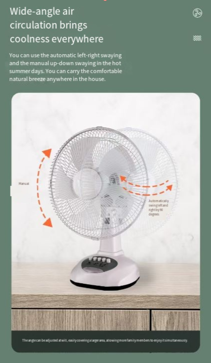Força do vento forte: Design de circulação de ar de grande angular, com uma ampla faixa de entrega de ar. Mesmo colocado em um canto, pode cobrir todo o espaço com frescor, dissipando facilmente o calor do verão.