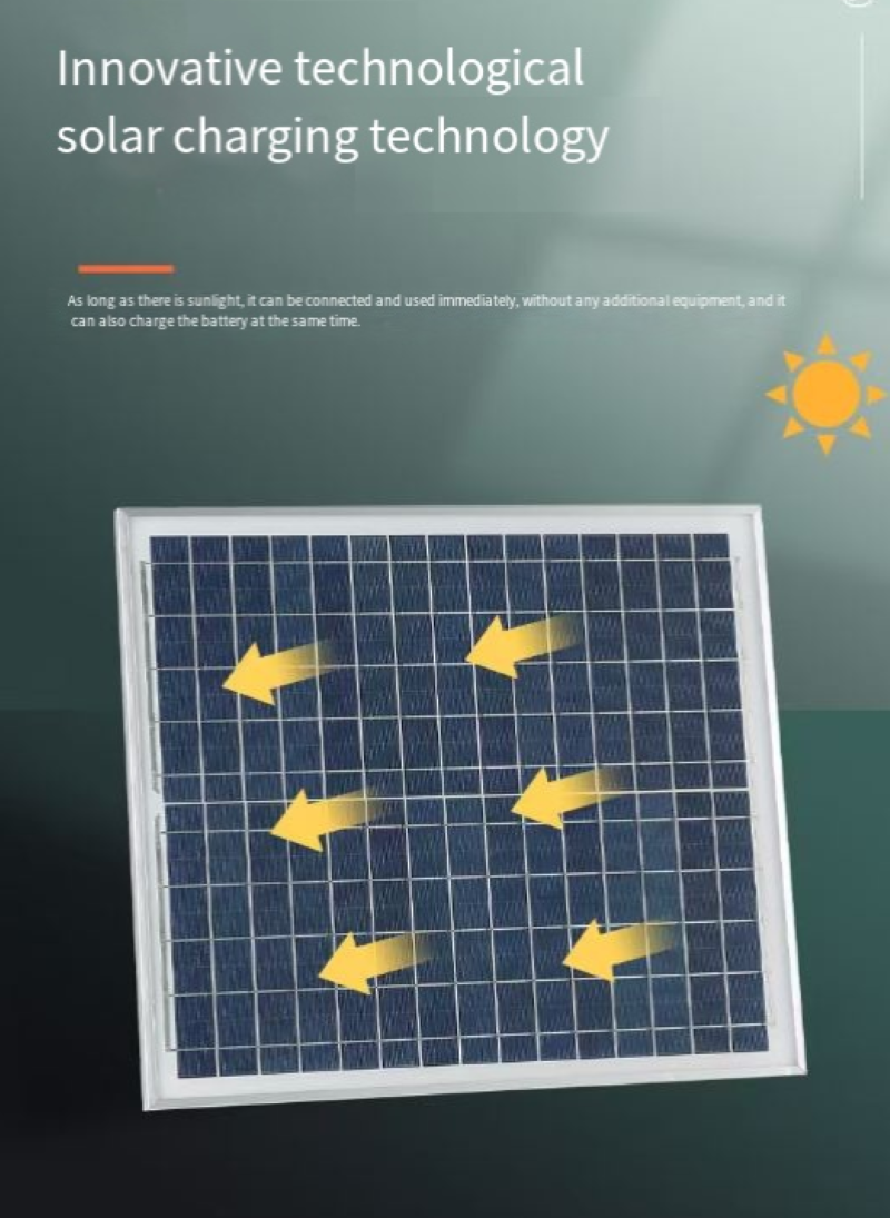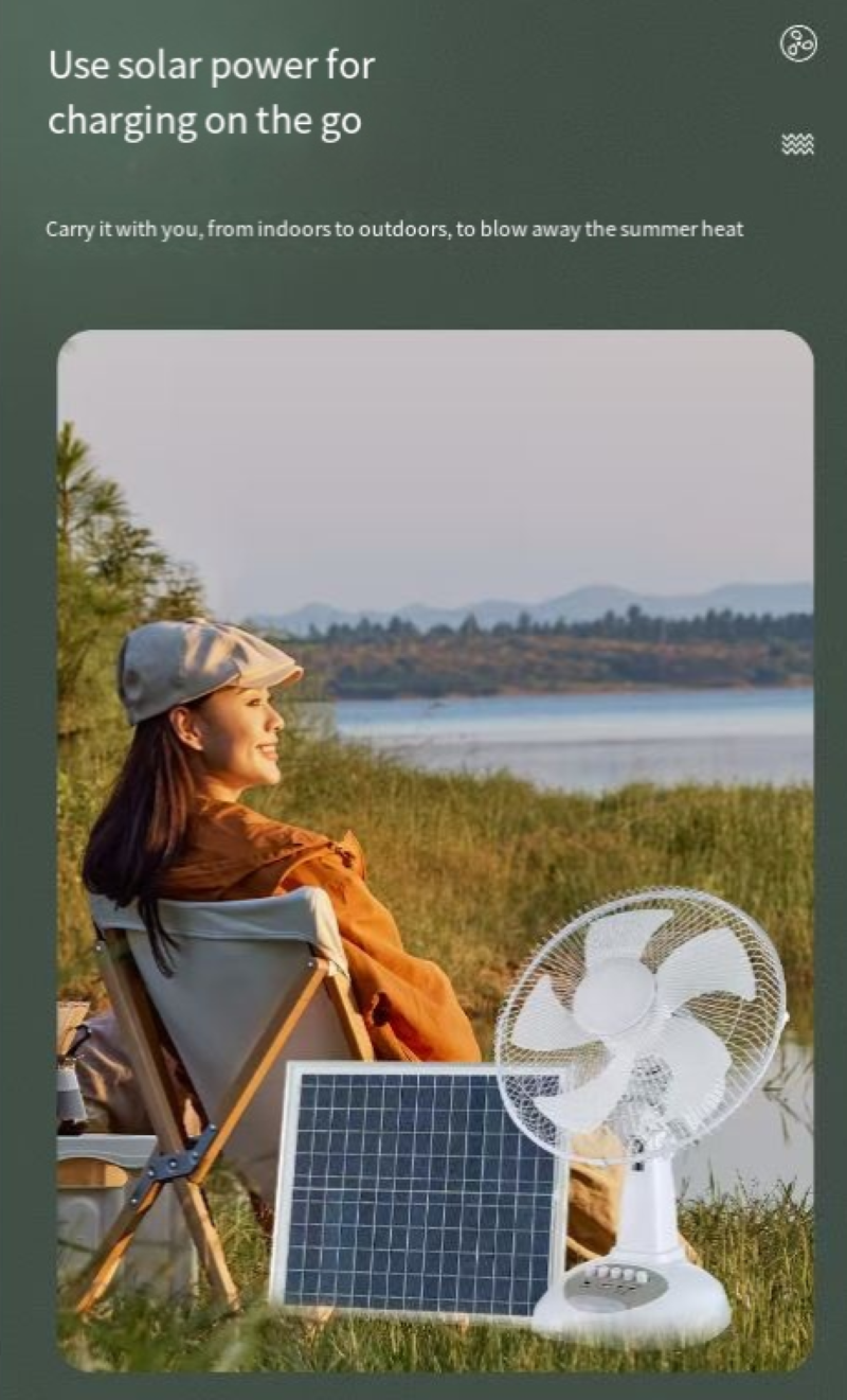 Está equipado com tecnologia inovadora de carregamento solar. Desde que haja luz solar, pode ser conectado e usado imediatamente, sem a necessidade de equipamento adicional. Também pode carregar a bateria interna simultaneamente. Seja no terraço, no jardim ou na planície aberta de um acampamento, desde que haja luz solar suficiente, o ventilador pode fornecer ar fresco continuamente.