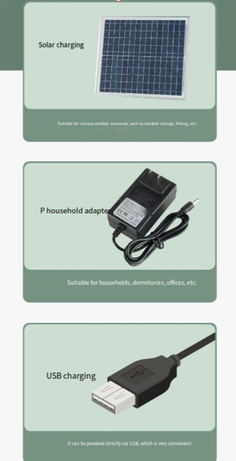 Também suporta carregamento via USB e é compatível com dispositivos comuns, como power banks e computadores. Quando usado em casa, basta plugá - lo para uso. Quando ao ar livre, use um power bank para aumentar a duração da bateria. Até mesmo você pode “pré - carregar” o ventilador para poder desfrutar da brisa fresca a qualquer momento em cenários sem luz solar - realmente alcançando “Quando há luz, há vento; mesmo sem energia, pode ser carregado” - alcançando a liberdade energética.