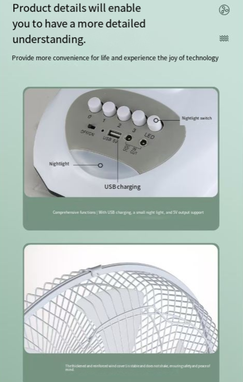 Emergência em casa: queda de energia? Equipado com uma bateria de lítio recarregável que pode durar de 9 a 24 horas, com três configurações de velocidade do vento para atender a diferentes necessidades. Combinado com uma luz noturna suave, serve como ventilador de resfriamento e luz de emergência, permitindo que você lide com calma com situações no escuro.