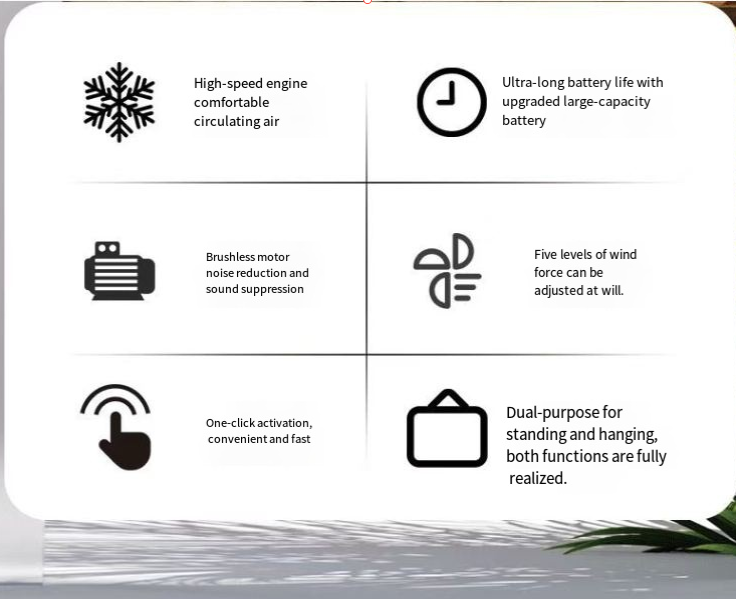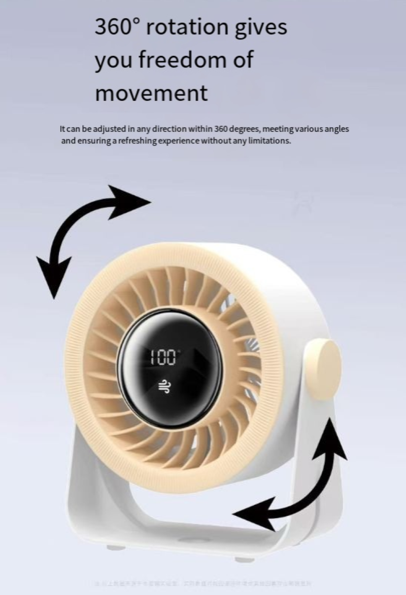 O design é extremamente elegante, com várias opções de cores, como laranja vibrante e roxo elegante. Colocado na mesa ou canto, parece uma decoração delicada para casa. O 机身 é pequeno, mas poderoso, suportando ajuste de vários ângulos. Seja colocado na mesa para aliviar a fadiga do trabalho ou no quarto para acompanhá-lo ao sono, ele pode fornecer ar com precisão, mantendo-o constantemente envolto em frescor.