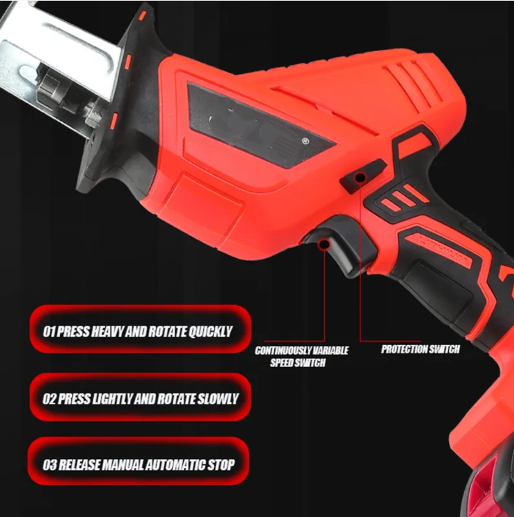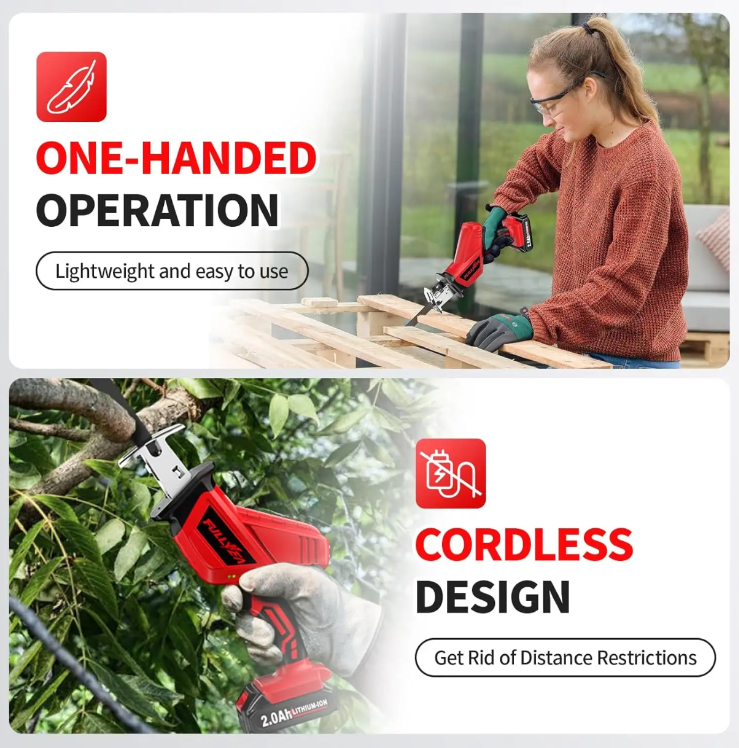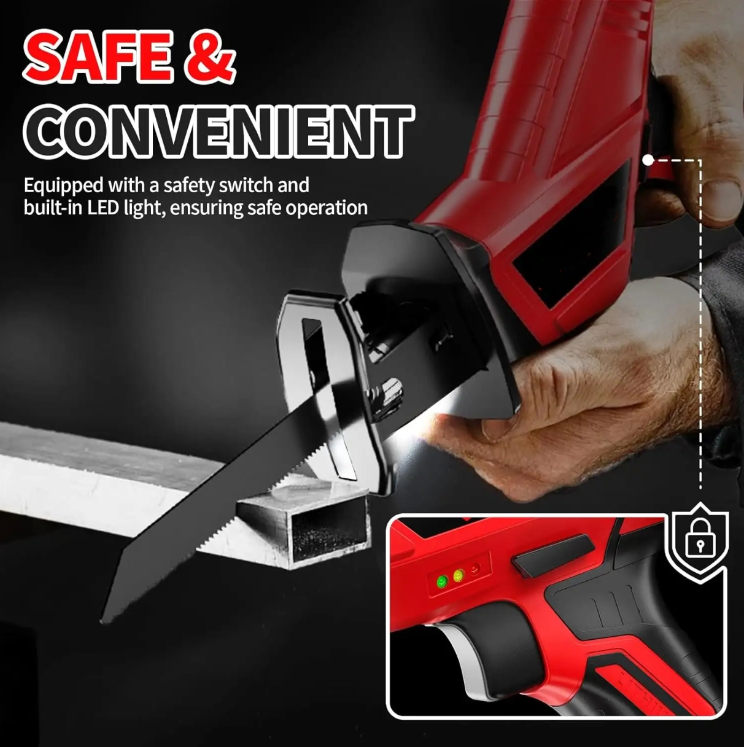 Seu sistema de energia de bateria de lítio é a base para um corte eficiente: equipado com uma bateria de lítio de grande capacidade, pode realizar um grande número de tarefas de corte com uma única carga, eliminando completamente a limitação dos cabos de alimentação; Seja cortando toras nas profundezas do pátio ou manuseando canos de metal em um canto da garagem, o trabalho pode começar a qualquer momento, a "liberdade sem fio" deixa a cena de corte mais restrita e, com as 4 lâminas de funções diferentes, madeira, metal, tubos de PVC, etc., podem ser "resolvidos com uma única serra".