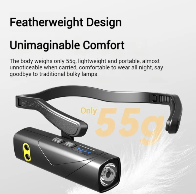 "Silencioso" ao extremo: a lanterna de cabeça de 55g montada no ouvido não pressiona sua cabeça, e você vai se sentir confortável usando-a a noite toda.