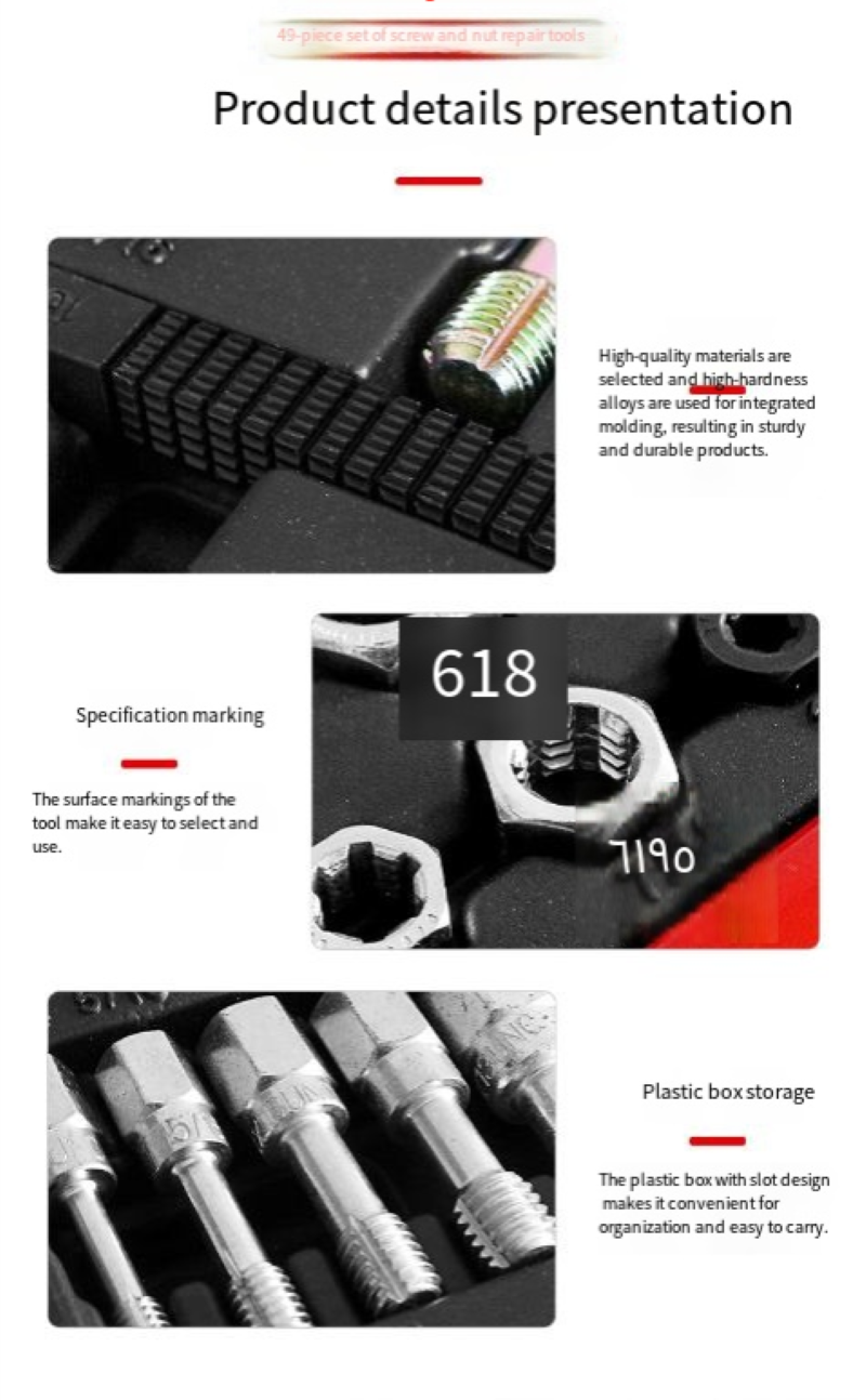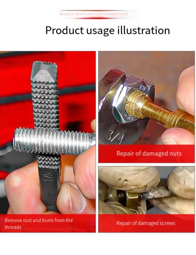 Seja você um mecânico de automóveis profissional ou um amante que gosta de mexer com máquinas, este kit de ferramentas de reparo de parafusos e porcas de 49 peças é seu assistente confiável. Ele pode ajudá-lo a resolver todos os tipos de problemas de reparo de roscas e desmontagem antiferrugem, transformando a manutenção mecânica de uma "tarefa dolorosa" em um "trabalho relaxante". Com ele, você não precisa mais ficar desamparado ao enfrentar problemas de rosca e pode desfrutar do prazer do reparo mecânico com tranquilidade!