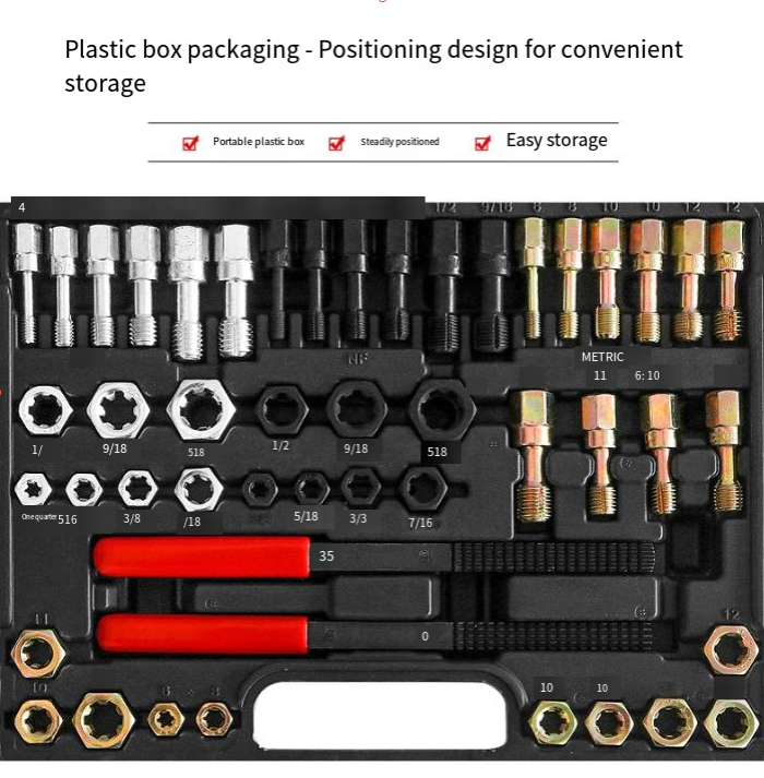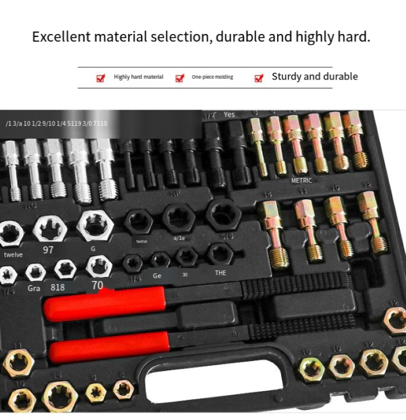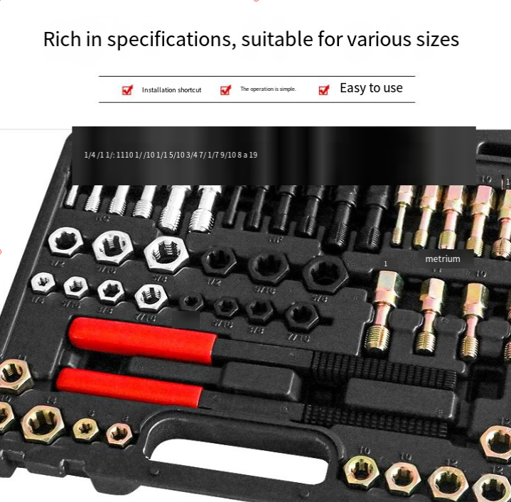 Esta ferramenta pode ser descrita como uma "enciclopédia de problemas de rosca", incluindo várias especificações de machos, reparadores de roscas e ferramentas de desmontagem antiferrugem. Quer se trate das roscas precisas de um motor automotivo ou das grandes porcas de equipamentos de máquinas agrícolas, ele pode combinar com precisão. Por exemplo, se você encontrar um parafuso descascado, o reparador de rosca correspondente pode restaurar rapidamente a rosca; Ao lidar com uma porca enferrujada e presa, a ferramenta de desmontagem antiferrugem pode remover facilmente a ferrugem, tornando a desmontagem extremamente suave.