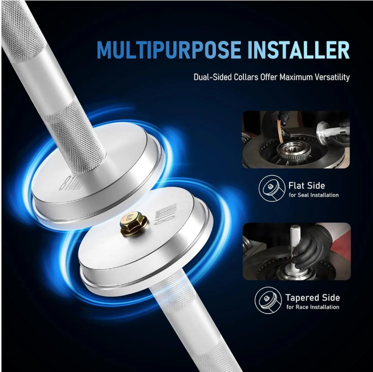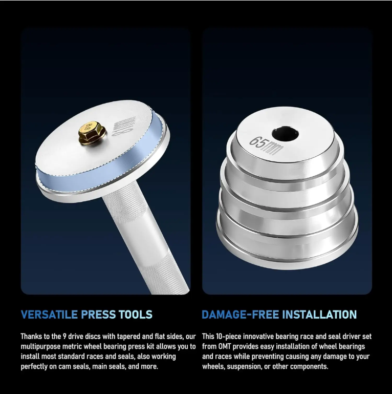 A característica central é sua cobertura abrangente de múltiplas especificações: os 10 acessórios incluem 8 placas de instalação de tamanhos diferentes + hastes guia, cobrindo as especificações de rolamento da maioria dos modelos de veículos, eliminando a necessidade de trocar frequentemente as ferramentas. Com apenas um conjunto, você pode manusear vários tipos de rolamentos para instalação de prensagem. A superfície da liga de alumínio é tratada com anodização, que é à prova de ferrugem e desgaste, e não se deforma mesmo sob uso prolongado e intenso.