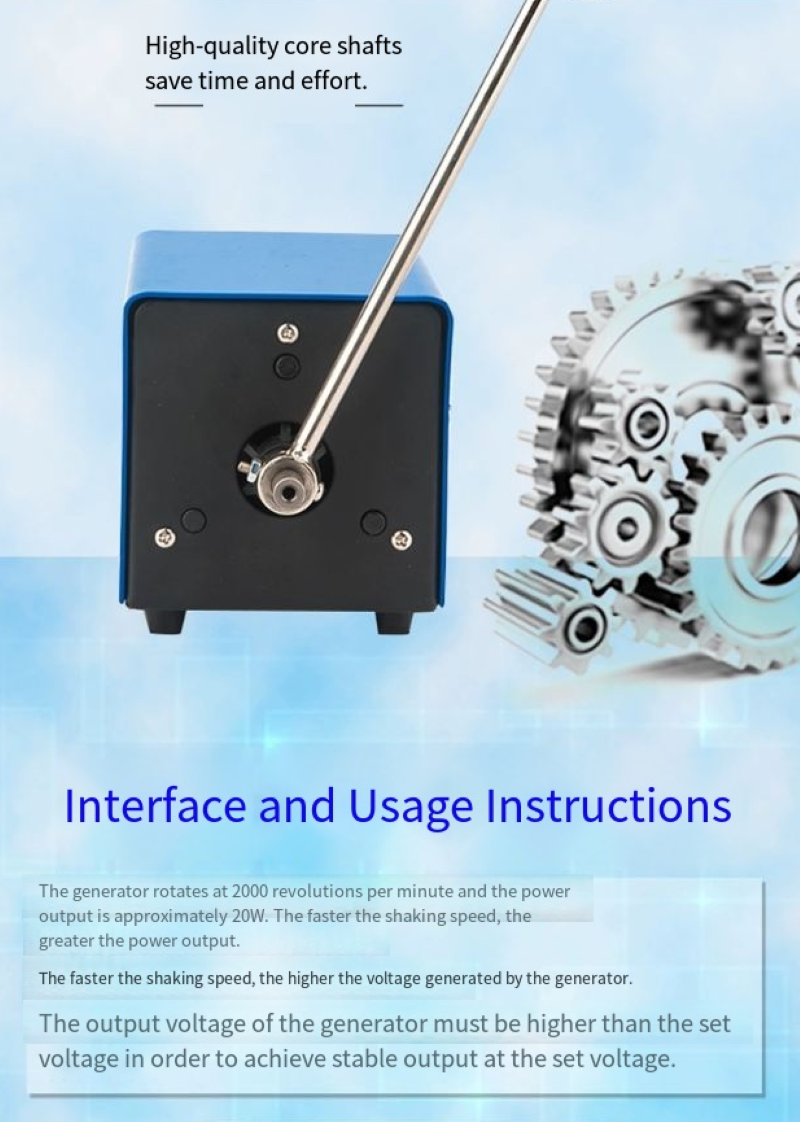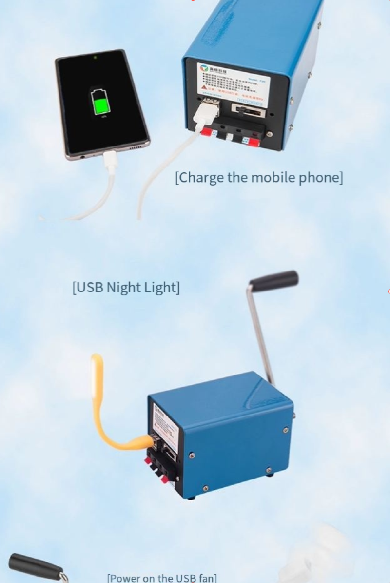Sua principal vantagem é que ele converte eletricidade instantaneamente a cada virabrequita: basta segurar a alavanca e girá-la em velocidade constante para gerar energia rapidamente. Ele suporta interfaces USB para carregamento direto, permitindo o carregamento de pequenos dispositivos como celulares e power banks. Também pode ser conectado a lâmpadas para uso em mercados noturnos ou em iluminação externa. Ela não depende da rede elétrica e pode resolver necessidades de energia a qualquer hora e em qualquer lugar.