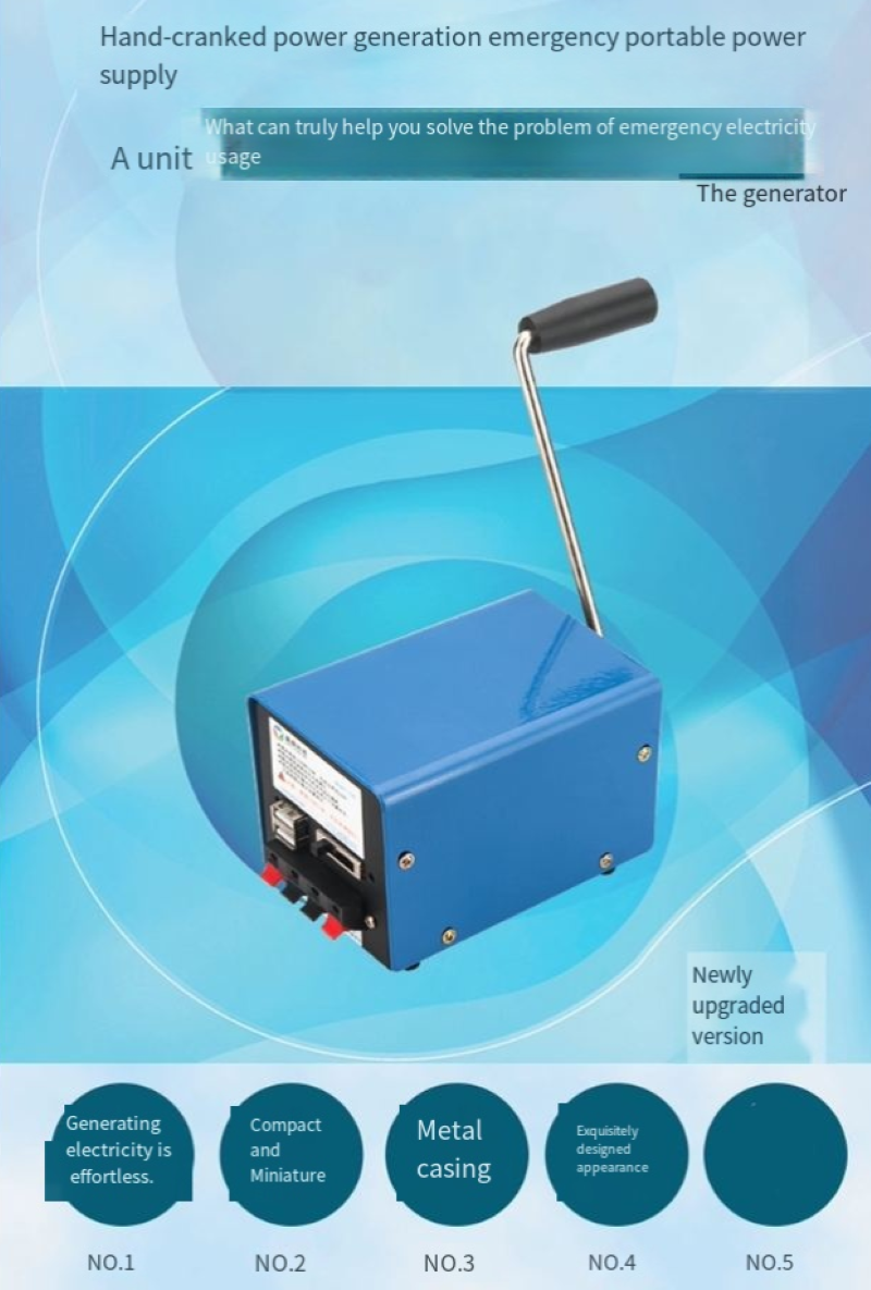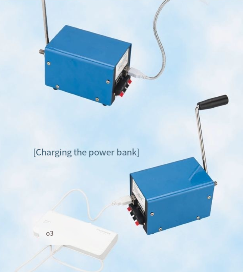 Sua característica principal é um sistema eficiente de geração de energia: segurando a manivela e girando-a em velocidade constante, é possível gerar eletricidade – quando o telefone ficar sem energia, conecte-o à porta USB e gire-o por alguns minutos para recarregar; quando houver uma queda de energia, conecte-a à luz LED para iluminar a situação de emergência, e não há necessidade de esperar a rede elétrica restabelecer.
