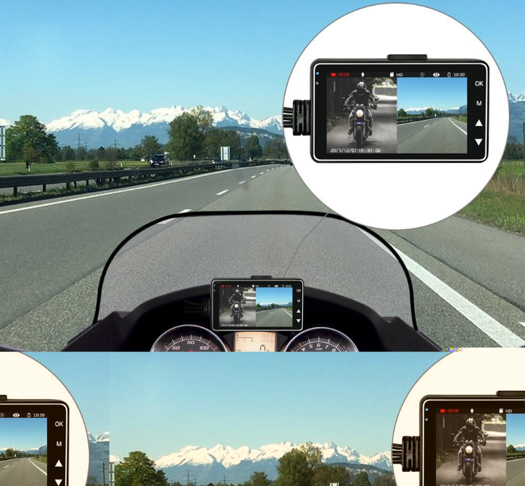 Ele está equipado com um sistema de câmera dupla dianteira + traseira: a câmera frontal captura as condições à frente do veículo, a traseira cobre o ponto cego na traseira do veículo, e a tela de 3 polegadas pode exibir as cenas frontal e traseira lado a lado – ao esperar no sinal vermelho, é possível ver os veículos que se aproximam pela traseira, E ao subir morros ou fazer curvas, você pode prever a posição do veículo atrás de você, então não precisa ficar olhando para trás com frequência, e sua pilotagem será mais focada.
