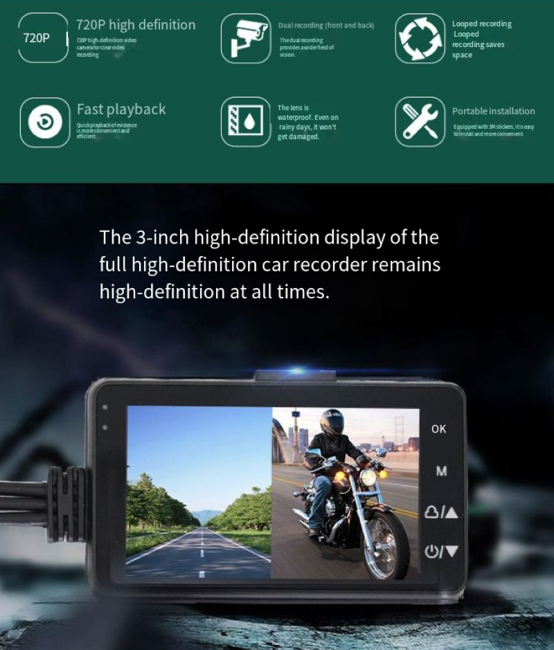 A operação também é muito conveniente: uma tela de alta definição de 3 polegadas está embutida diretamente no guidão, e você pode olhar para ela enquanto pedala para ver a imagem em tempo real; Ele suporta gravação em loop e pode ser usado inserindo um cartão e, em caso de colisão, bloqueia automaticamente o vídeo para evitar que seja sobrescrevido, sem a necessidade de operação manual para reter evidências. A carroceria é feita de material reforçado resistente a choques e desgaste, capaz de suportar as vibrações durante a condução de motocicletas, vento e exposição ao sol, e até mesmo os botões são projetados com recursos antiderrapantes, permitindo fácil operação mesmo com luvas.