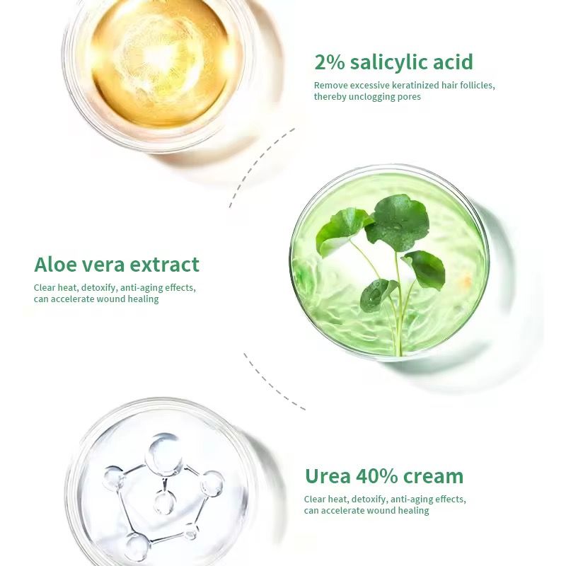 A força central desse produto está em sua "combinação ampla" de 40% de ureia de alta concentração + 2% ácido salicílico: a ureia, como fator natural hidratante na pele, pode penetrar na camada de queratina, amolecendo a queratina antiga e morta acumulada enquanto repõe o "filme de travamento de água" para pele seca, melhorando fundamentalmente o ciclo de "ficar mais seco e duro, e depois rachando ainda mais severamente"; O ácido salicílico a 2% age como uma "escova suave para polir", removendo delicadamente a queratina grossa e dura enquanto desentupe os poros, evitando desconforto em áreas ásperas e até iluminando as articulações mais opacas com o tempo.