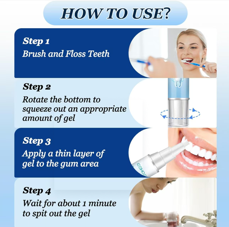 A força da adesão gengival afeta diretamente a estabilidade dos dentes. Os componentes reforçadores do gel de restauração Gum Protect podem aumentar a aderência entre gengivas e dentes, assim como adicionar um "adesivo forte" entre os dentes e as gengivas, tornando os dentes mais estáveis e menos propensos a afrouxar. Ao mesmo tempo, também pode reduzir a inflamação e o desconforto das gengivas, permitindo que você diga adeus aos problemas das gengivas inchadas e sangrando e aproveite um ambiente oral confortável.
