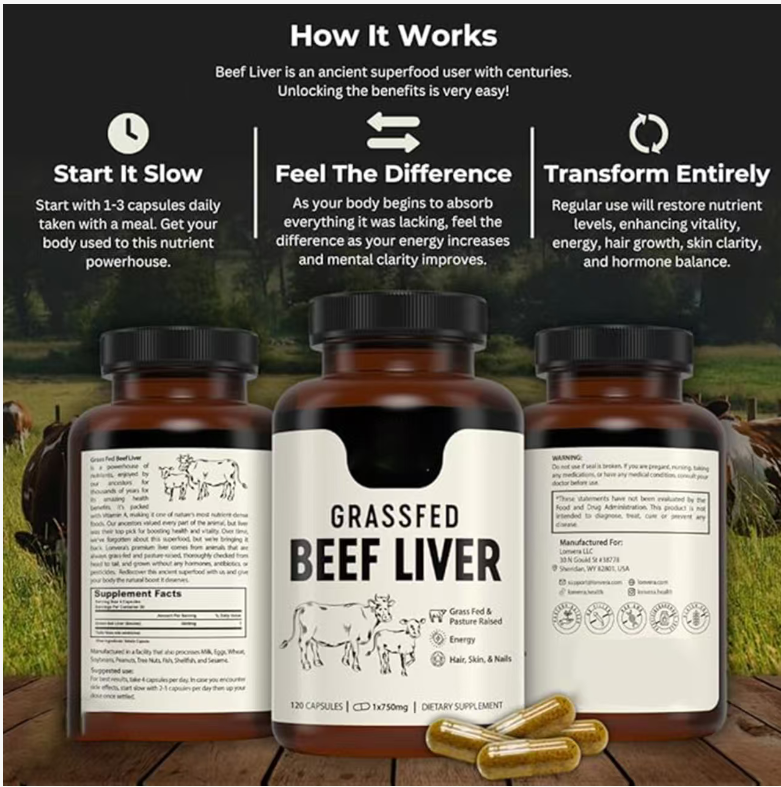 O fígado de boi alimentado com pastagem é considerado um superalimento com benefícios notáveis à saúde desde tempos antigos. Nossos ancestrais conheciam seu valor e o usavam como uma ótima forma de melhorar a saúde e a vitalidade. Hoje, por meio de técnicas avançadas, combinamos essa sabedoria ancestral com tecnologia moderna para concentrar a essência nutricional do fígado de carne bovina alimentado com pastagem nessas pequenas cápsulas, tornando conveniente para você desfrutar desse presente natural a qualquer hora e em qualquer lugar.