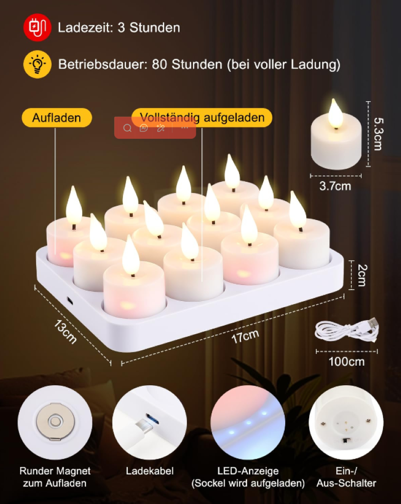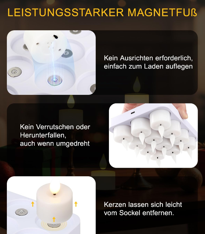 O pacote é cuidadoso e prático: vem com uma base de carregamento + um fio complementar, permitindo carregar várias velas simultaneamente, e é conveniente para armazenamento; a forma pequena é adequada para vários cenários – colocando em uma mesa de centro, pendurado na parede ou complementando uma árvore de Natal, basta colocar em qualquer lugar e vira uma obra-prima da atmosfera.