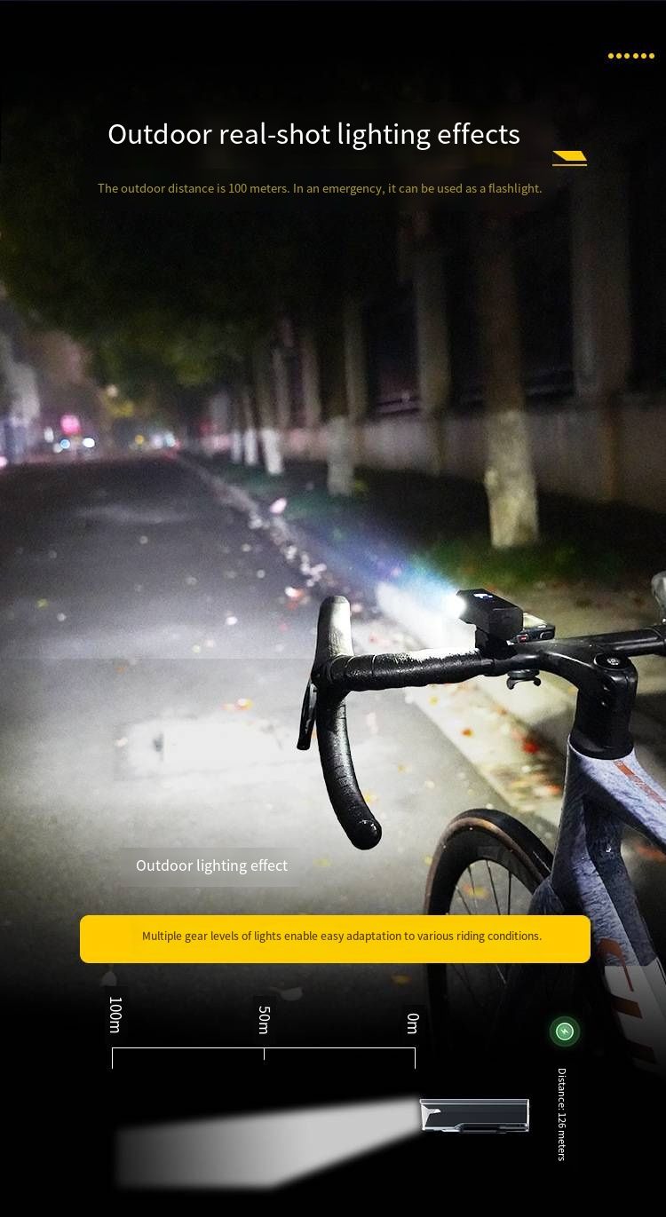 Esta luz de bicicleta é verdadeiramente a "guardiã da segurança" para passeios noturnos. Tem um alcance de 100 metros e oferece iluminação externa clara à noite, que é visível mesmo no escuro. Em situações de emergência, também pode ser usado como lanterna. É equipado com um modo de sensor de luz, que pode ligar e desligar automaticamente a luz. Ele acenderá automaticamente ao entrar em um túnel ou em uma área escura e desligará automaticamente ao sair. Este design libera completamente suas mãos. Ele adota um design de base elástica de liberação rápida, que é compatível com vários guidões e é instalado de forma estável sem tremer. Esteja você andando na chuva à noite ou viajando tarde da noite, ele pode iluminar o caminho à sua frente, proporcionando uma experiência de pilotagem segura e conveniente.