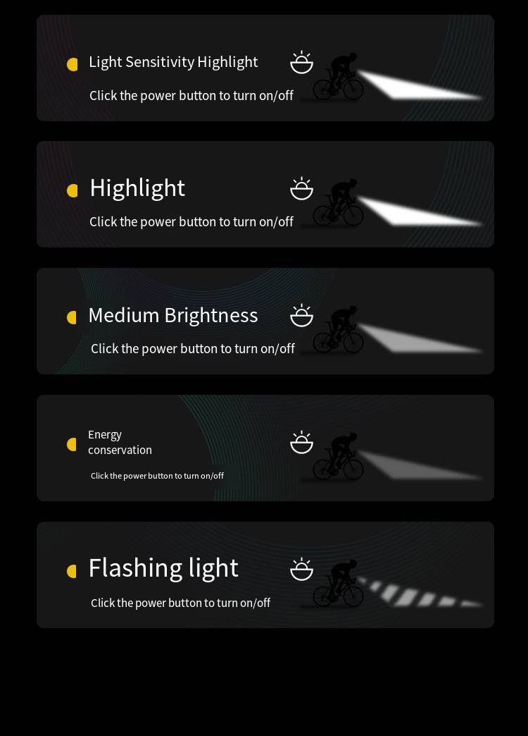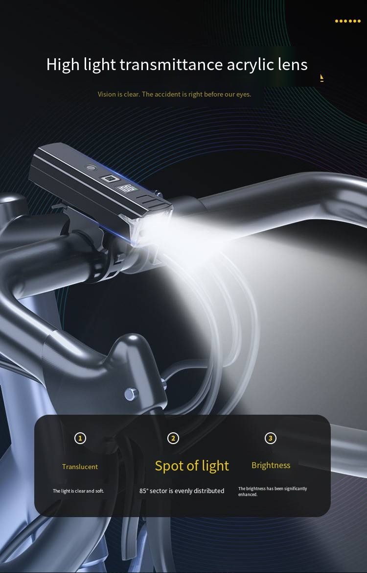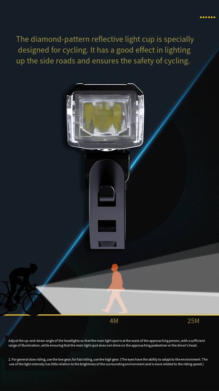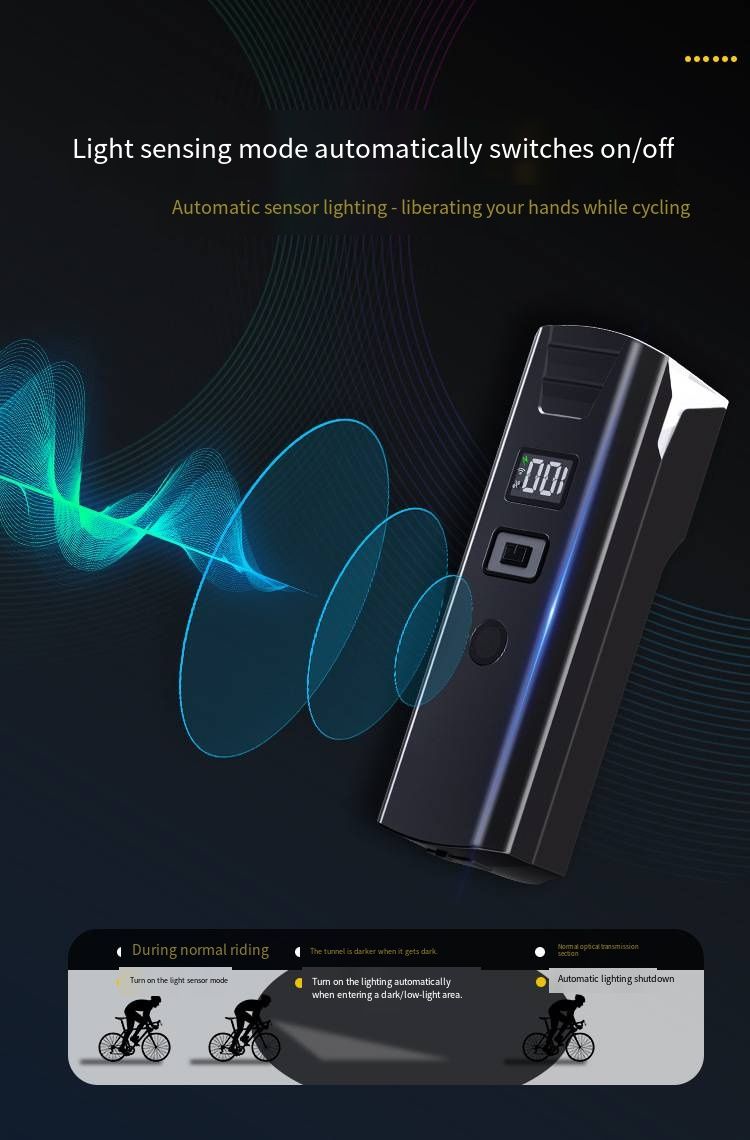 É o "gerenciador inteligente" de luz, equipado com um modo de detecção de luz inteligente que pode detectar automaticamente a intensidade da luz ambiente. Ele acende as luzes quando escurece e as apaga quando fica claro, liberando completamente suas mãos e permitindo que você se concentre no ciclismo. O farol antirreflexo de 65 art tem uma ampla faixa de iluminação e brilho uniforme, que pode iluminar a estrada à frente, sem causar forte interferência de luz em pedestres ou veículos que se aproximam, tornando as ultrapassagens noturnas mais seguras.
