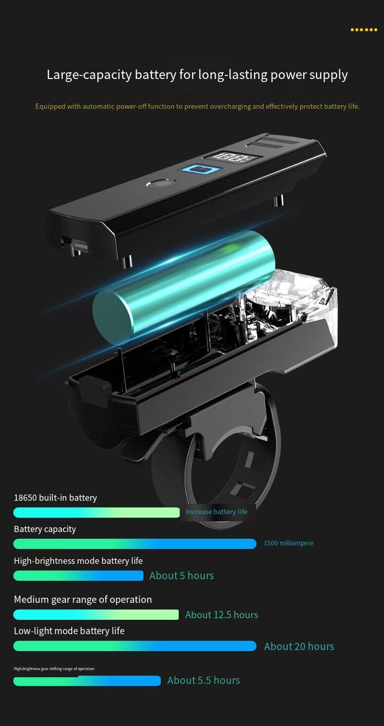 É o "guerreiro persistente" da duração da bateria, suportando carregamento rápido Type-C, com carga completa permitindo 5 a 20 horas de vida útil prolongada da bateria (dependendo do modo de brilho). Ele possui uma função de exibição de nível de bateria integrada, tornando o nível restante da bateria claro à primeira vista e eliminando a preocupação de perda repentina de energia no meio do passeio. O design de carregamento portátil USB também permite que ele seja carregado conectando-se a vários dispositivos, como computadores e bancos de energia, permitindo o "reabastecimento" durante o ciclismo ao ar livre.