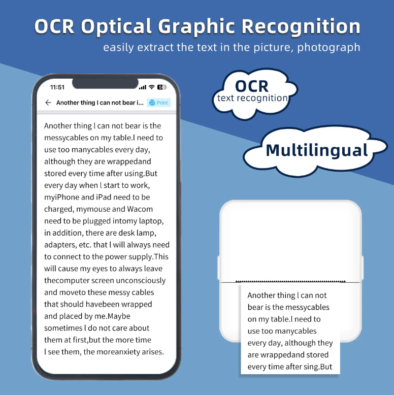 É equipado com a tecnologia OCR (Optical Character Recognition), que pode extrair com precisão texto de imagens e documentos. Quer se trate de pontos de conhecimento em livros didáticos, informações valiosas em páginas da web ou rascunhos de inspiração manuscritos, basta tirar uma foto para reconhecimento e ela pode ser convertida instantaneamente em texto imprimível. Ao mesmo tempo, suporta vários tipos de impressão, como texto, imagens, etiquetas e listas: os alunos podem usá-lo para organizar erros e destacar pontos-chave, tornando o conhecimento "visual"; os profissionais podem imprimir itens de tarefas e atas de reuniões, tornando o trabalho "organizado"; No dia a dia, pode imprimir guias de viagem e fotos de família, tornando as memórias "físicas". O efeito de impressão de alta definição garante que cada saída seja clara e detalhada, sem perda durante a conversão da tela para o papel.