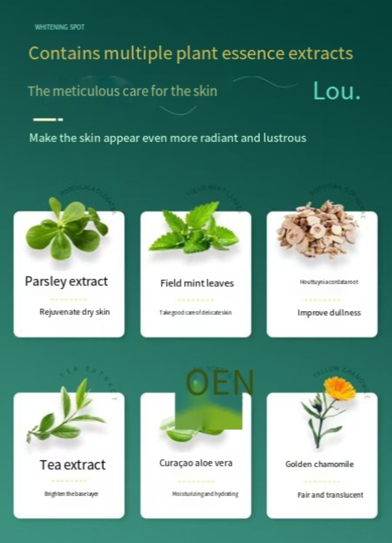 Este creme de essência contém uma variedade de essências vegetais preciosas e ingredientes clareadores altamente eficazes. Ele penetra profundamente nas camadas da pele, inibindo a produção de melanina em sua fonte, assim como um preciso "atirador de melanina", tornando impossível esconder qualquer mancha. Ao mesmo tempo, pode acelerar o metabolismo da pele, metabolizando gradualmente a melanina existente, permitindo que a pele irradie um brilho natural de dentro para fora.