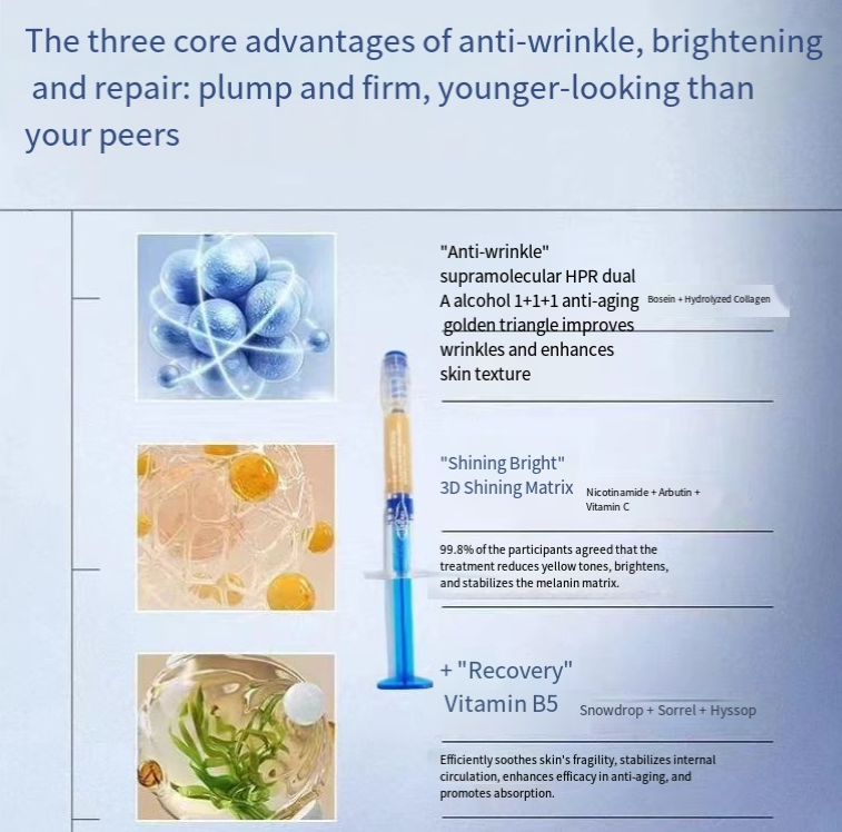 O efeito central atinge precisamente os pontos dolorosos da região dos olhos: a penetração direcionada de ingredientes anti-rugas pode penetrar nas linhas finas e repará-las. Persistir no uso por uma semana pode fazer com que as linhas secas "fiquem mais leves e macias"; O fator de contração combinado com ele é como dar aos músculos oculares um "suporte oculto", contraindo gradualmente a sensação de flacidez ao redor dos olhos e nos cantos externos; Ao mesmo tempo, os ingredientes hidratantes e firmes profundos podem reter a umidade na camada da derme da região dos olhos, fazendo com que a área originalmente seca dos olhos revele um brilho volumoso e transparente.