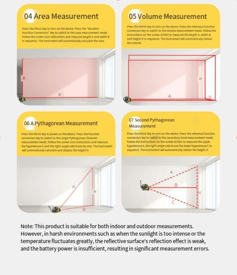 De bricolage doméstico a trabalho de engenharia profissional, ele pode se adaptar perfeitamente. Com esta fita métrica a laser multifuncional 3 em 1, é como ter uma equipe de medição profissional no bolso, permitindo medições precisas a qualquer hora e em qualquer lugar, garantindo a segurança de todas as suas medições e melhorando significativamente a eficiência do trabalho e da vida.