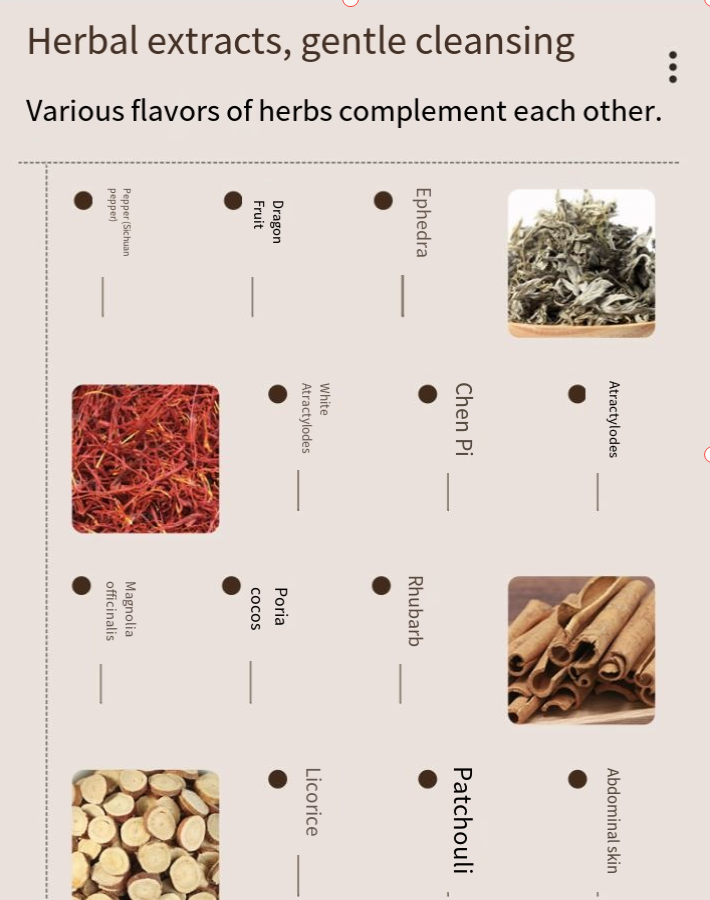Selecionadas entre doze ervas naturais, como artemísia, folha de lótus e jujuba, elas são cuidadosamente misturadas cientificamente e extraídas de forma concentrada. A antiga sabedoria de preservação da saúde é integrada à moderna tecnologia de aplicação para manchas de pele. A artemísia promove a circulação e dissipa o frio, a folha de lótus remove a gordura e alivia a umidade, e a jujuba fortalece o baço e promove o metabolismo. Os múltiplos efeitos atuam juntos no corpo, regulando a constituição úmida e fria desde a raiz, tornando o "edema e a obesidade" impossíveis de esconder. Pode ser considerado o "especialista em despertar leve" para o corpo.