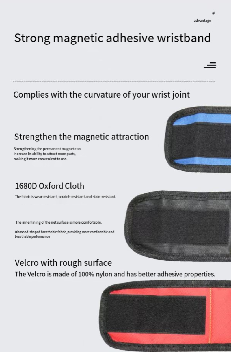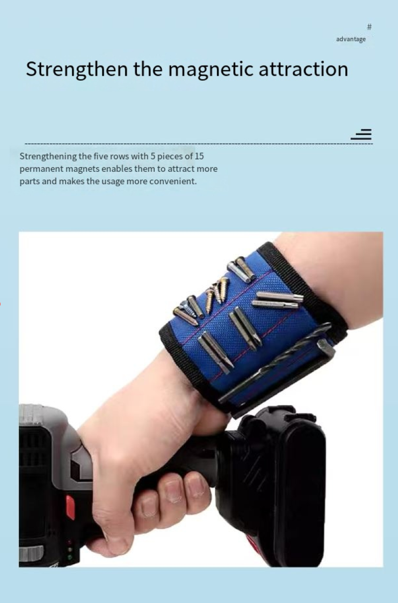 A pulseira é equipada com múltiplos ímãs de neodímio-ferro-boro de alta densidade, proporcionando forte aderência: ela pode "segurar" parafusos, pregos, brocas e porcas com firmeza, e não cai mesmo ao dobrar ou levantar a mão; Ele pode comportar até 10+ parafusos ou 5-8 pregos por vez, permitindo que você complete uma tarefa sem precisar reabastecer os suprimentos com frequência e evitando a ineficiência de pegar peças repetidamente.