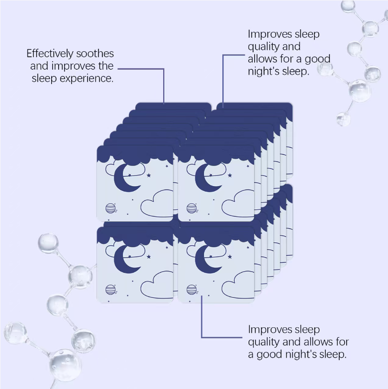 O adesivo calmante para o sono contém uma variedade de essências naturais de ervas, que são o precioso auxílio para dormir concedido pela natureza. Entre elas, o óleo de lavanda, com sua fragrância única, acalma suavemente nossas mentes e corpos, alivia os nervos tensos e permite que corpo e mente mergulhem em um estado de tranquilidade; O componente lúpulo pode aliviar efetivamente o estresse, acalmar os nervos e dissipar a ansiedade e o desconforto internos; A adição de jasmim melhora ainda mais a qualidade do sono, permitindo que os nervos alcancem um relaxamento profundo.