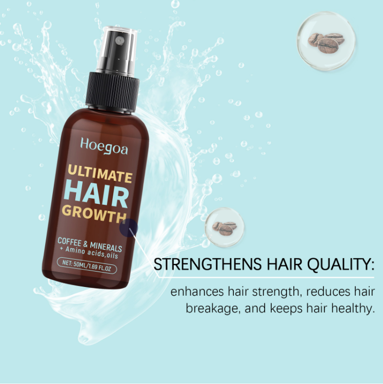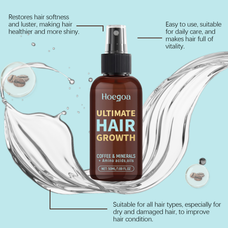 O spray para crescimento capilar contém café, minerais, vitaminas e aminoácidos. Um spray leve pode nutrir profundamente os fios do cabelo – ele repara os danos causados por permanentes e colorações, reduz quebras, além de suavizar o frizz e dar brilho, deixando o cabelo forte e brilhante. Tem uma textura refrescante e não oleosa, e é fácil de usar a qualquer momento com apenas um leve spray. Não depende de uma camada grossa de óleo de silicone para suavidade. O núcleo de sua composição é uma combinação de ingredientes "suaves para nutrição capilar":