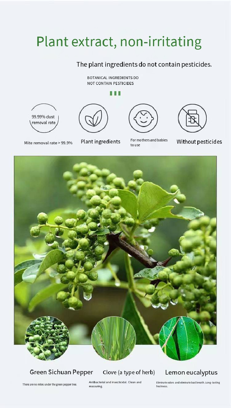 Você ainda sente coceira na pele causada por ácaros e pela limpeza dos tecidos? O Spray Antiácaros Yunnan Botanical Qinghuajiao pode ajudar! É sem lavagem nem secagem ao ar, extremamente conveniente. Apenas um spray pode penetrar profundamente no tecido e matar efetivamente os ácaros ocultos. Também pode inibir o crescimento de ácaros.