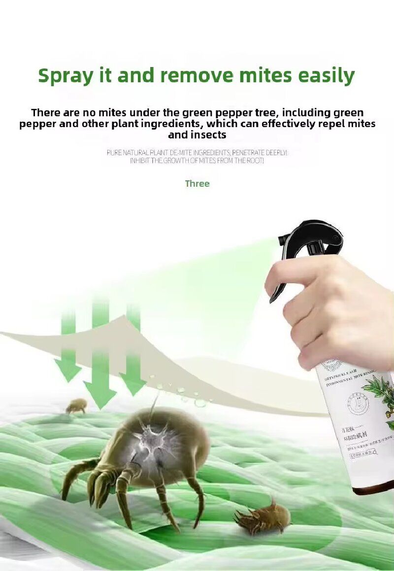 Com o núcleo do extrato natural de Qinghuajiao e uma fórmula suave, é seguro para uso em vários cenários, como roupas de cama, sofás e ninhos de pets. Após pulverizar uma vez, pode oferecer proteção duradoura por 15 dias. Não há necessidade de operações repetidas. Você pode facilmente eliminar os problemas causados por ácaros e manter seu ambiente doméstico fresco e livre de ácaros o tempo todo, com a pele menos coçando e mais confortável.