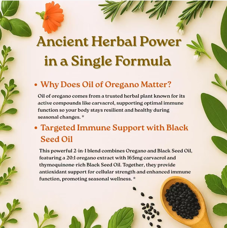 Seu núcleo é a "combinação poderosa" de óleo de orégano de alta concentração 20:1 e óleo de semente preta: