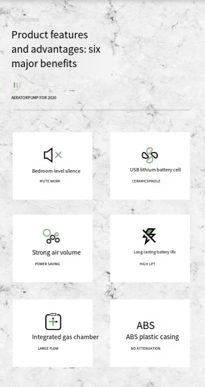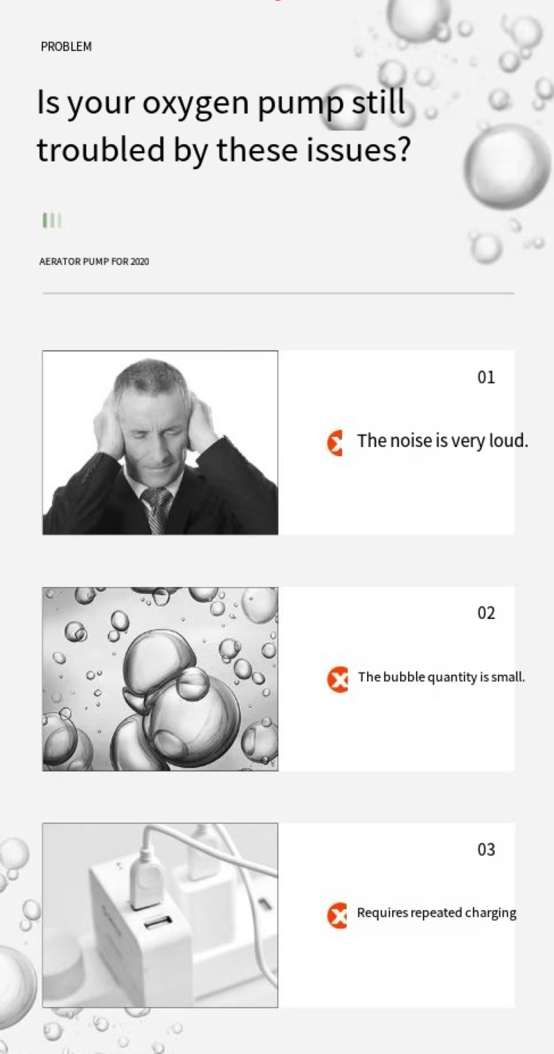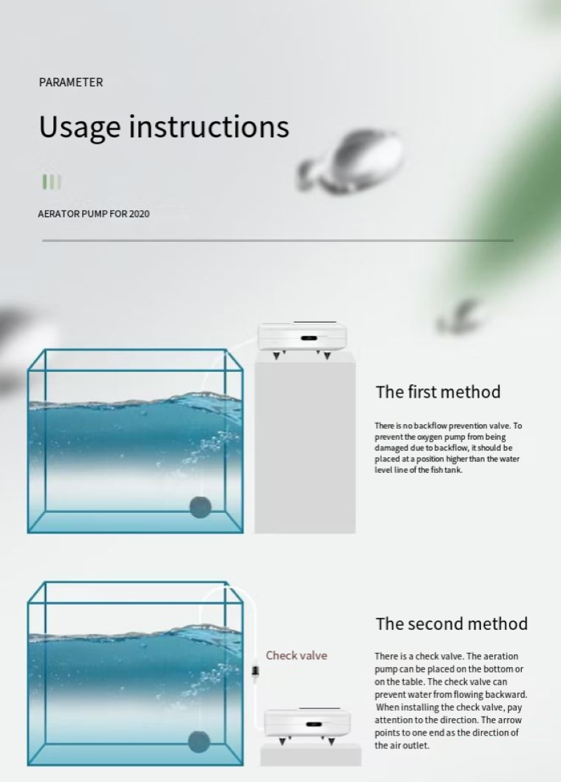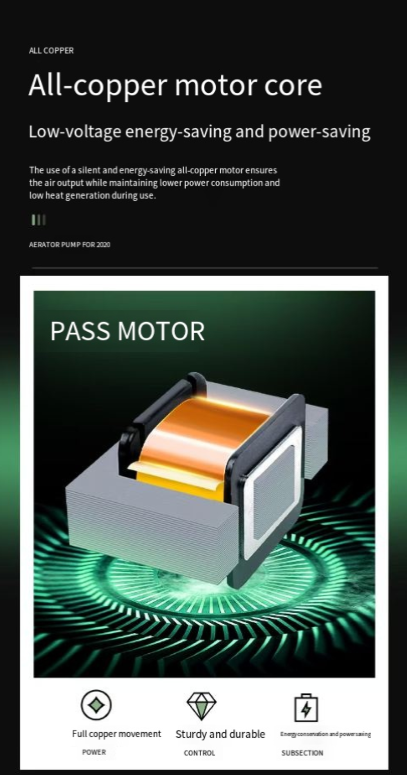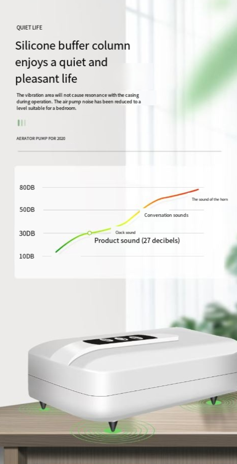 Além disso, essa bomba de oxigênio também dá grande ênfase ao design detalhado. Ele é equipado com pés de borracha antiderrapante, que podem se apoiar com segurança em várias superfícies e evitar deslizamentos ou tombamentos. Ao mesmo tempo, vem com acessórios como pedras de bolha e tubos de ar, permitindo que você o use imediatamente sem precisar comprar itens adicionais.