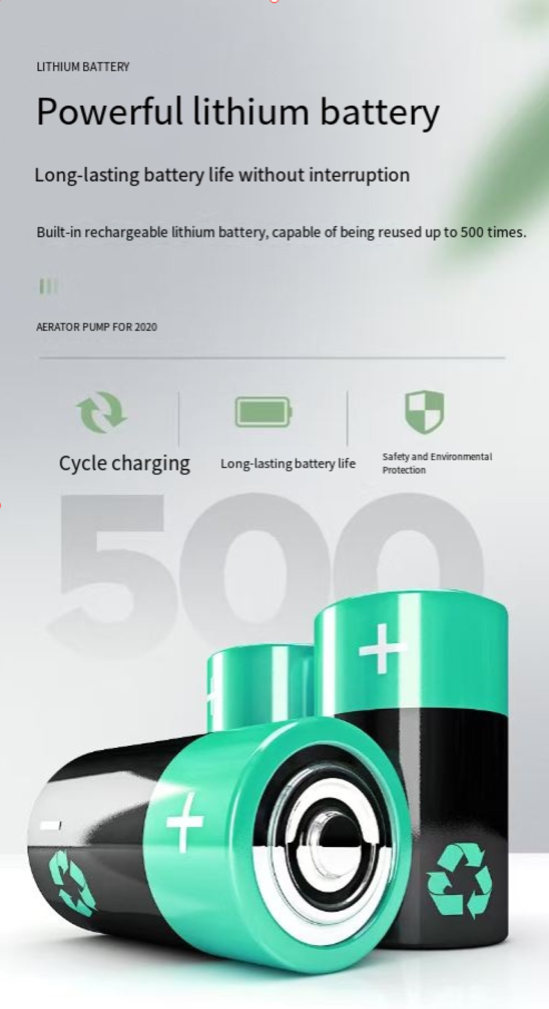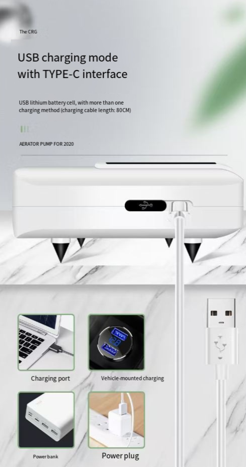Você pode estar preocupado se a pequena bomba de oxigênio tem potência suficiente. Não se preocupe nem um pouco! Essa bomba de oxigênio utiliza uma bateria de lítio de grande capacidade, com uma duração de bateria impressionante. Uma vez totalmente carregado, ele pode funcionar continuamente por várias dezenas de horas e, para uso intermitente, pode durar mais de 35 horas, o que é suficiente para atender às suas necessidades de pesca durante todo o dia. Além disso, suporta carregamento por USB. Seja um carregador de carro, um power bank portátil ou uma porta USB de computador, você pode carregá-lo facilmente, tornando-o conveniente e rápido.