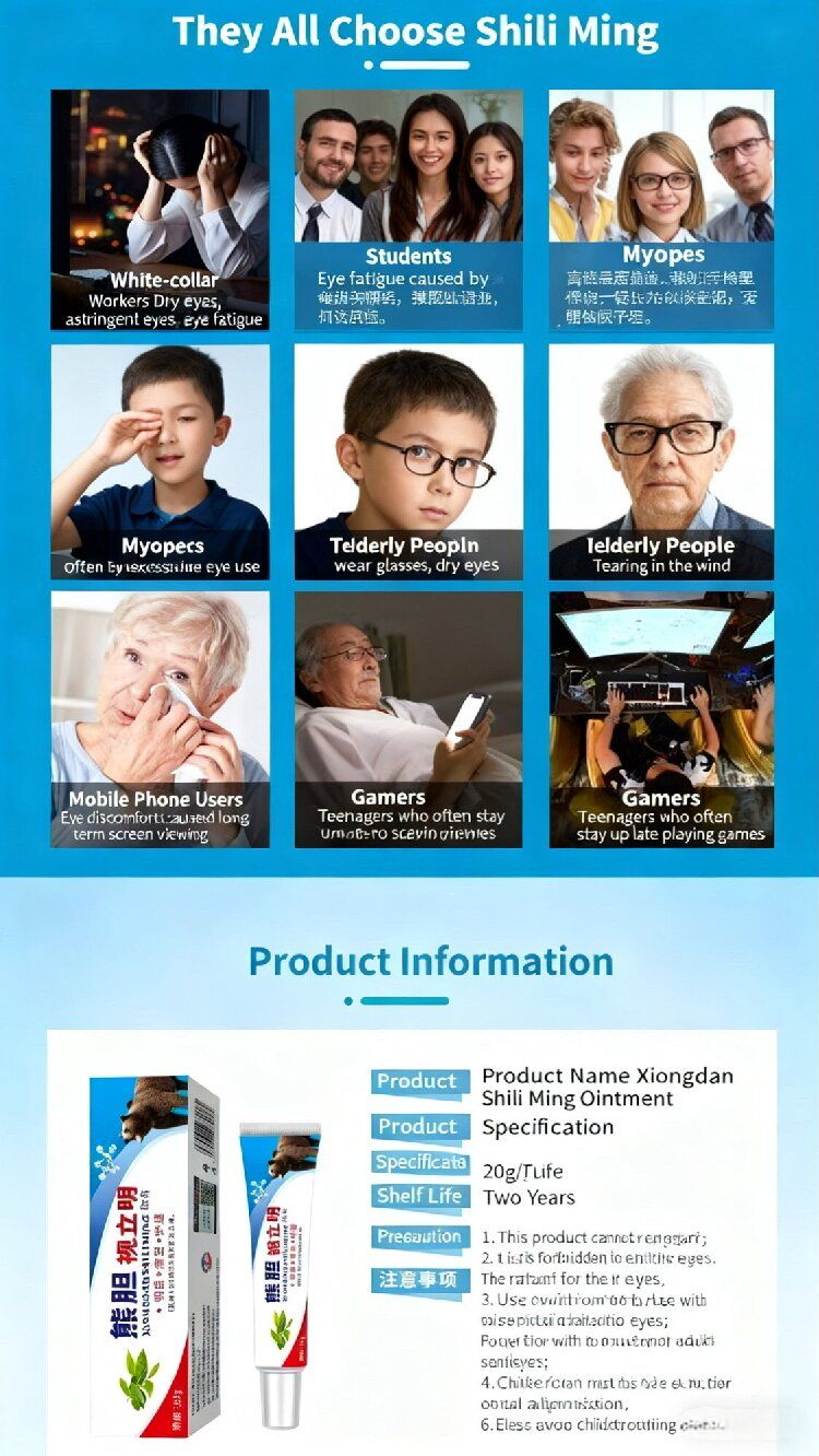 Na vida moderna, o uso prolongado dos olhos, a exposição à luz azul de telas eletrônicas e a irritação ambiental com poeira fizeram com que olhos secos, coceira nos olhos e visão turva se tornassem problemas comuns para muitas pessoas. Os olhos, como uma das partes mais vulneráveis do corpo humano, são difíceis de serem bem cuidados por meio da limpeza comum. No entanto, a pomada Xiongda Shili Ming é especialmente projetada para pessoas com desconforto ocular. Ele fornece proteção abrangente para seus olhos em três aspectos: melhorar a visão, limpeza e cuidados.