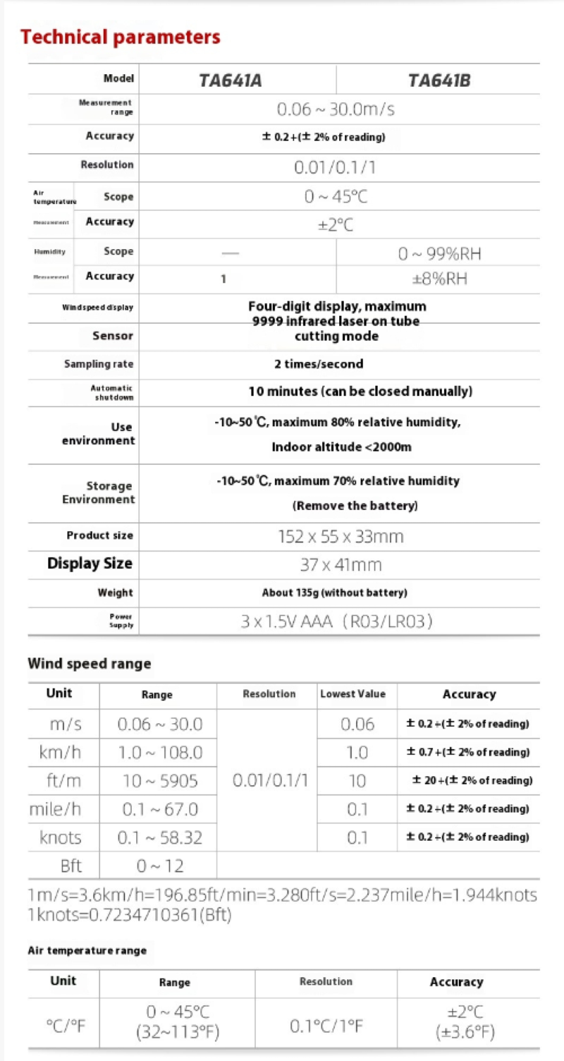 Medição de velocidade do vento: alcance de 0,3 a 30 m/s, resolução 0,1 m/s, suporta múltiplas unidades como km/h, mph, nós, etc. Ele pode capturar rapidamente mudanças na velocidade do vento, com erro de ≤ ±5% tanto para ventos suaves quanto fortes;