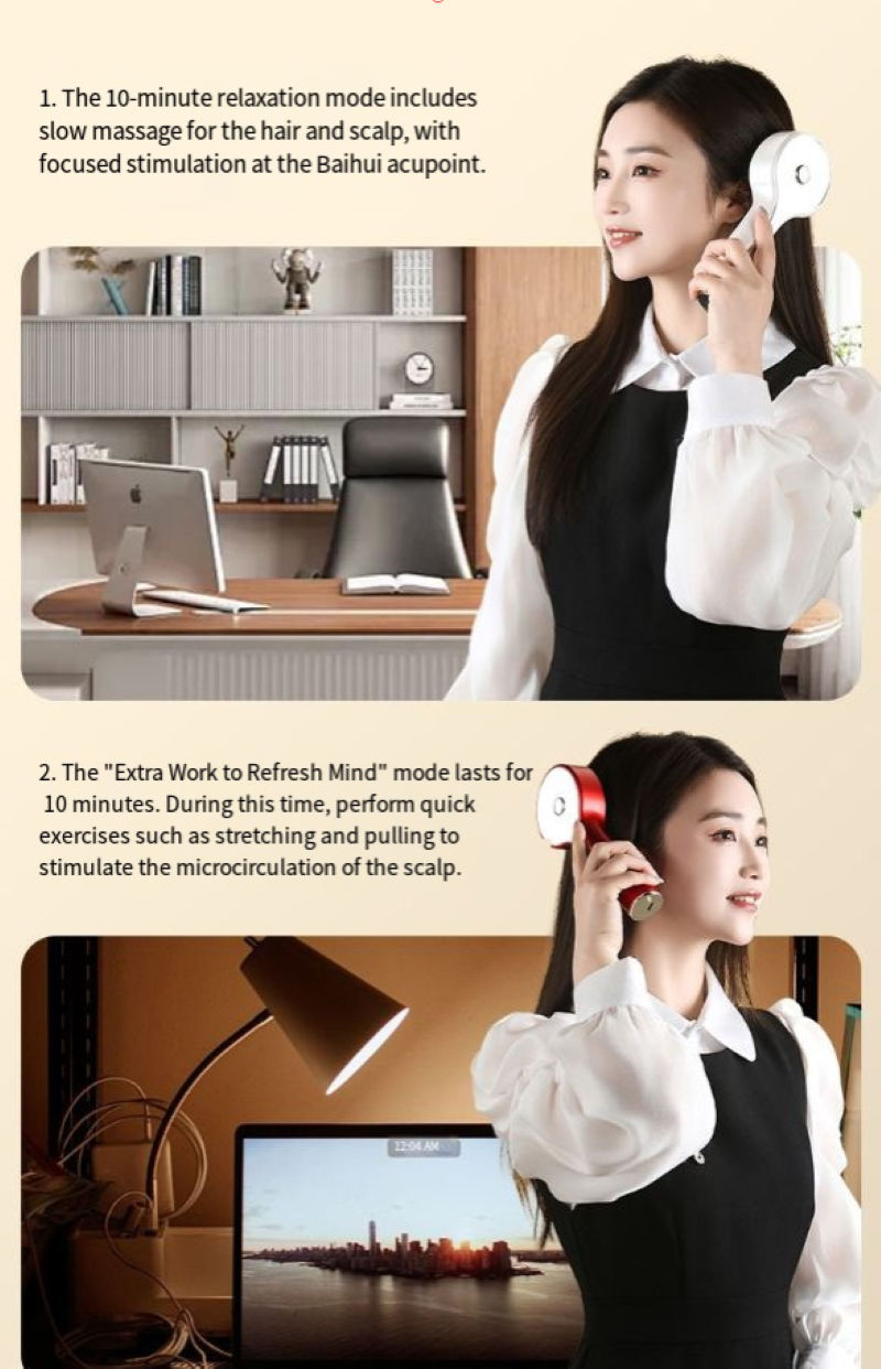 Ele é equipado com tecnologia de cuidado com ondas de luz vermelha, que utiliza luz vermelha de comprimento de onda específico para penetrar nos folículos capilares do couro cabeludo, ativando a vitalidade das células do couro cabeludo e melhorando o ambiente do couro cabeludo. O uso prolongado pode reduzir a caspa, aliviar o ressecamento do couro cabeludo e trazer o couro cabeludo de volta da "ansiedade apertada" para a "respiração relaxada". Ao mesmo tempo, simula a técnica de pressionar os dedos de um massagista profissional, com cabeças de massagem multi-contato que se ajustam 360° ao couro cabeludo. Seja por tensão mental do trabalho ou dor no couro cabeludo após ficar acordado até tarde, basta ligar o modo massagem, e pressionar suavemente pode aliviar rapidamente o estresse no couro cabeludo, promovendo a circulação sanguínea na cabeça. Cada massagem parece uma sessão profunda de yoga para o couro cabeludo.