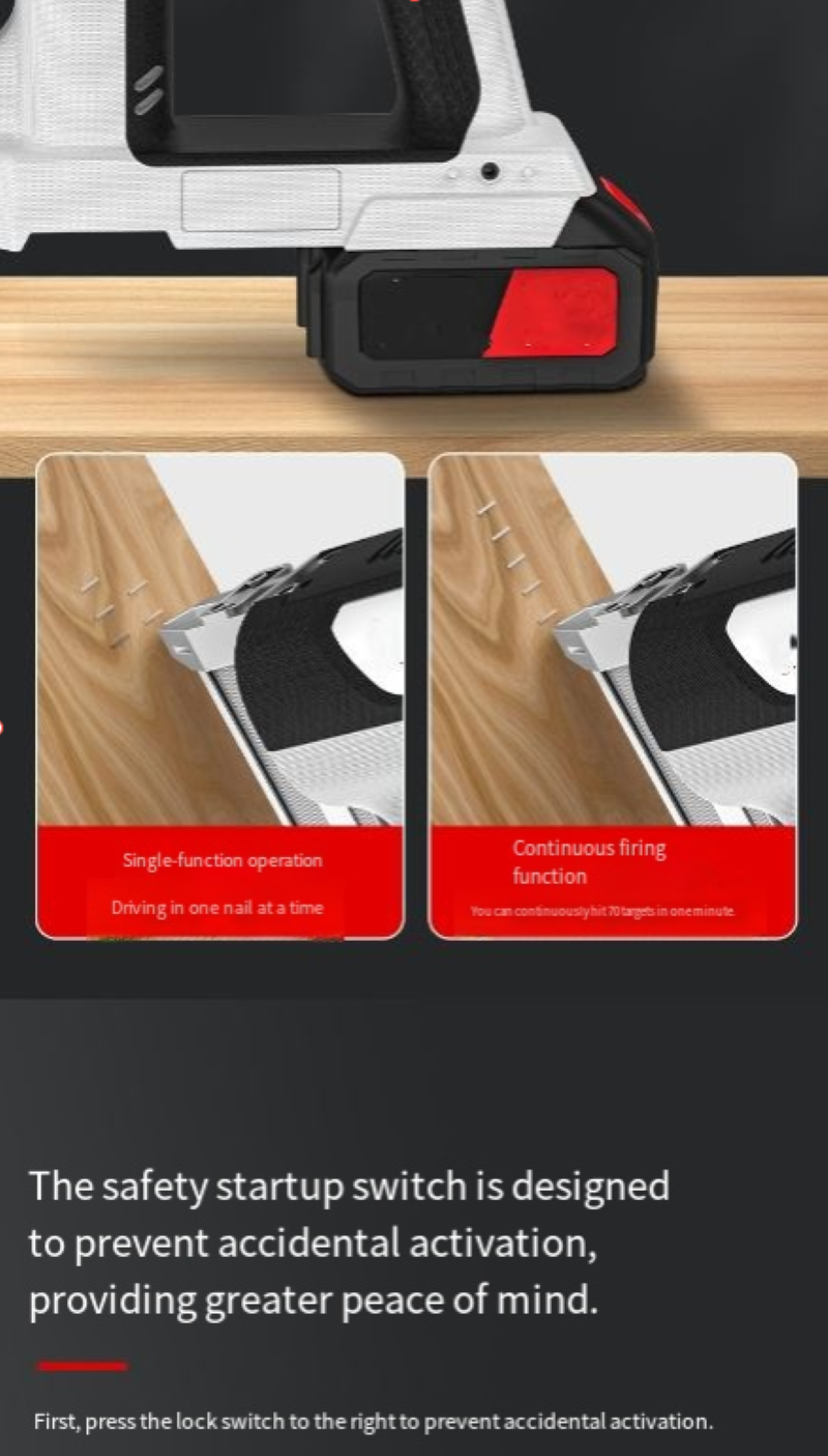 De decoração profissional a bricolage para casa, esta pistola de pregos alimentada por bateria de lítio pode lidar com tudo. Não é apenas uma ferramenta, mas também uma dupla garantia de eficiência e qualidade - permitindo que você escolha livremente entre a precisão do tiro único e a eficiência do modo burst, e com o suporte de 1.000 pregos de arma originais, você pode trabalhar com facilidade. Escolha-o e você estará escolhendo uma experiência de decoração mais despreocupada, um processo criativo mais eficiente, seja construindo a casa dos seus sonhos ou concluindo projetos profissionais, pode ajudá-lo a passar por isso perfeitamente.