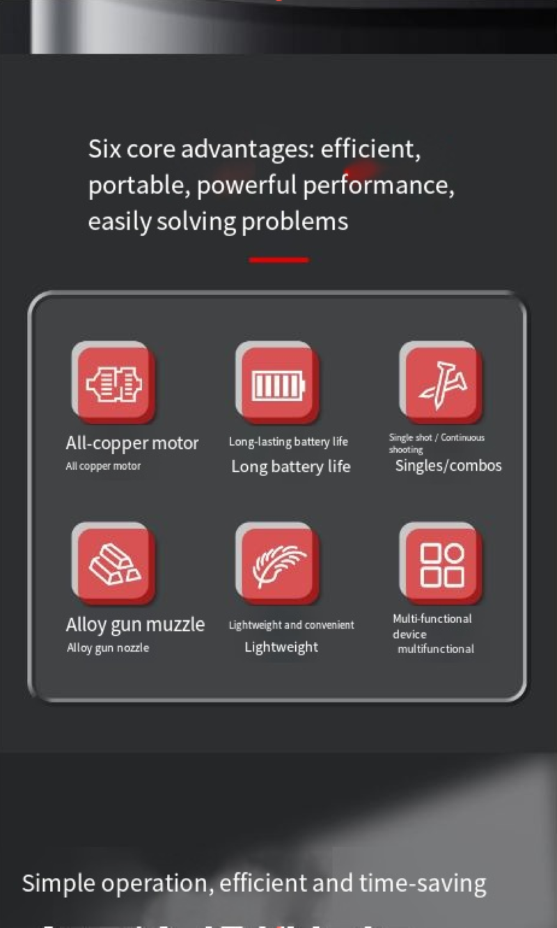 É também um "player acessível" em operação, com design de alça ergonômica, confortável de segurar sem escorregar e não propenso a fadiga durante a operação de longo prazo; O design transparente da câmara ungueal facilita a visualização do processo de pregar e despregar, mesmo para iniciantes, eles podem começar rapidamente. Os 1.000 pregos originais incluídos são resistentes e têm alta mordida, e os pregos não cairão depois de serem cravados na madeira, garantindo que cada construção seja sólida e confiável.