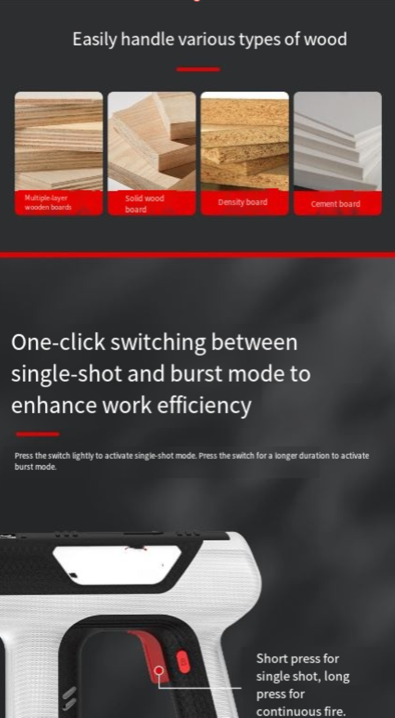 É a "besta poderosa" no mundo das pistolas de pregos, suportando a alternância livre entre os modos de disparo único e rajada: o modo de disparo único controla com precisão os pregos, adequado para marcenaria fina e montagem de móveis; O modo Burst aciona os pregos com eficiência, proporcionando o dobro da eficiência para decoração em grande escala e construção de molduras. É compatível com várias especificações de pregos de pistola (adequados para pregos F30) e pode atender com precisão a várias necessidades, desde a fixação de painéis até a instalação de rodapés e a criação de artesanato criativo. Uma pistola de pregos pode lidar com diversos requisitos.