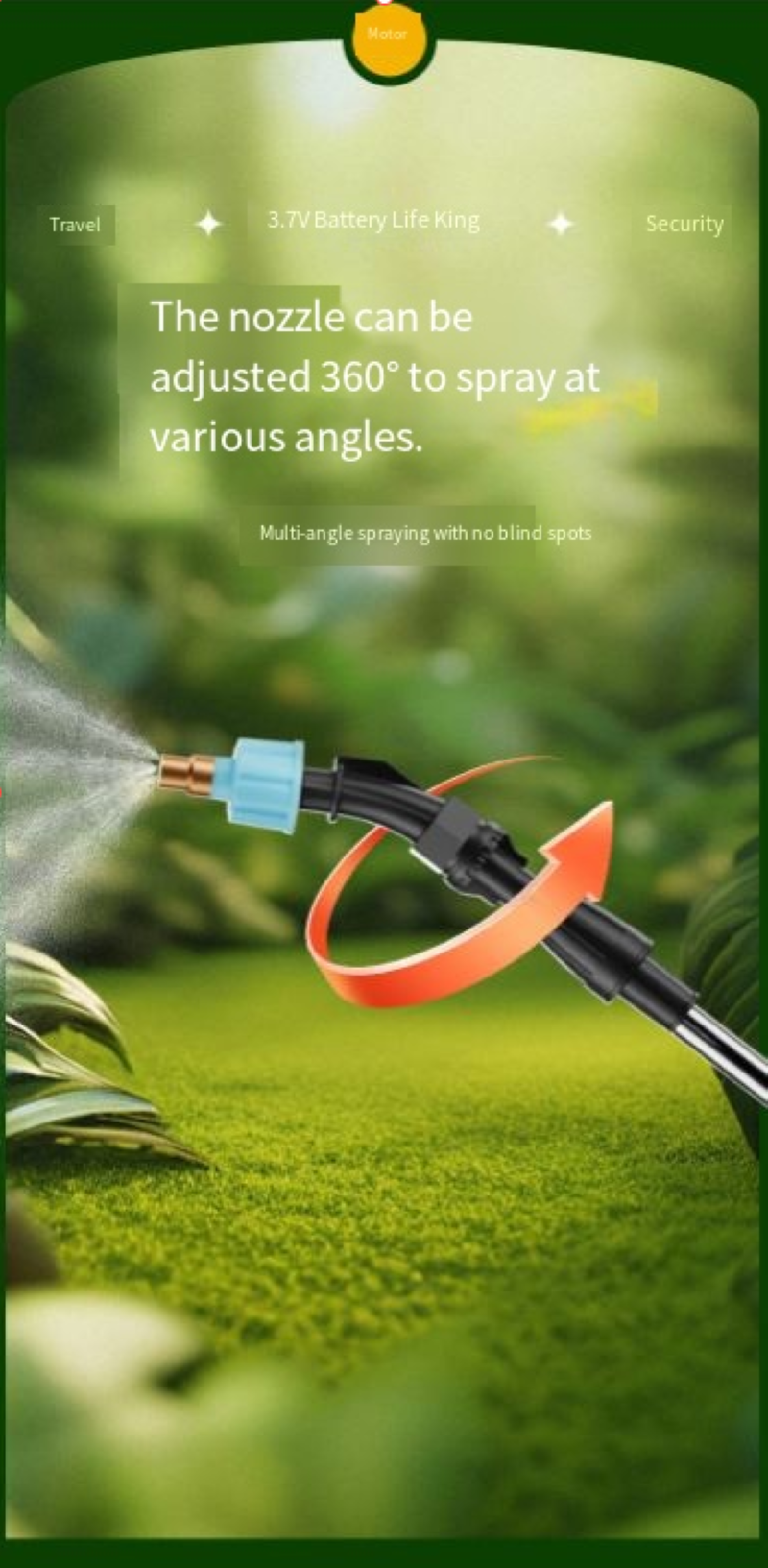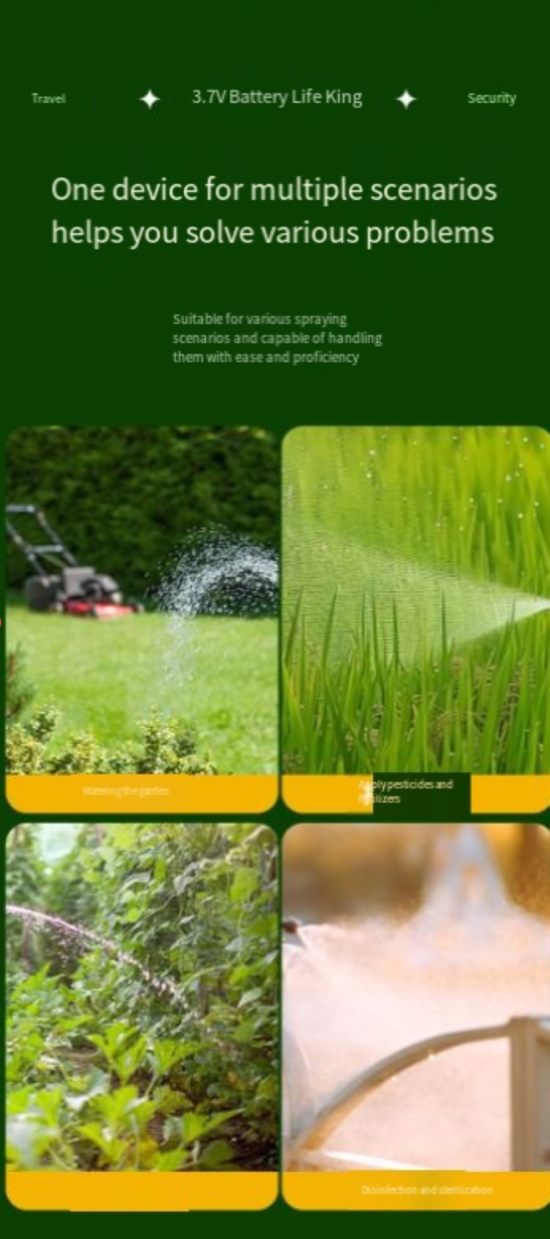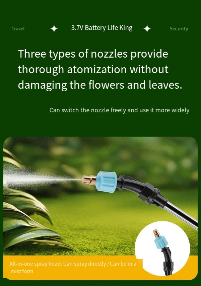 Em termos de potência, é equipado com um sistema de bateria de lítio de 3,7 V, com forte resistência e pressão de pulverização suficiente. Quando no modo de pulverização automática, a névoa fina e uniforme de alta pressão pulveriza continuamente, cobrindo uma ampla área e aderindo fortemente. Por exemplo, ao aplicar pesticidas em árvores, o líquido pesticida pode aderir uniformemente aos galhos e folhas, resultando em melhor controle de pragas e efeitos de fertilização; Ao regar flores e plantas, o fluxo de água semelhante a uma névoa é suave e não prejudica as plantas.