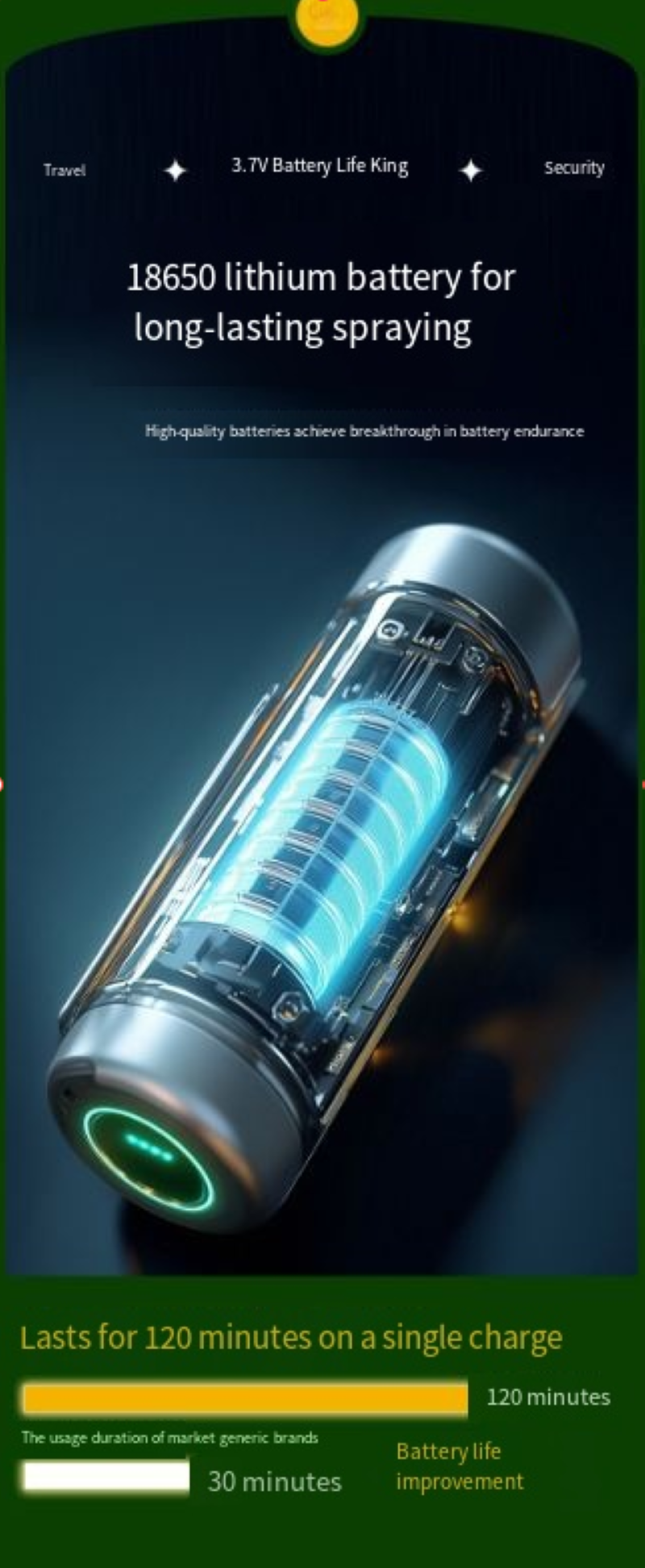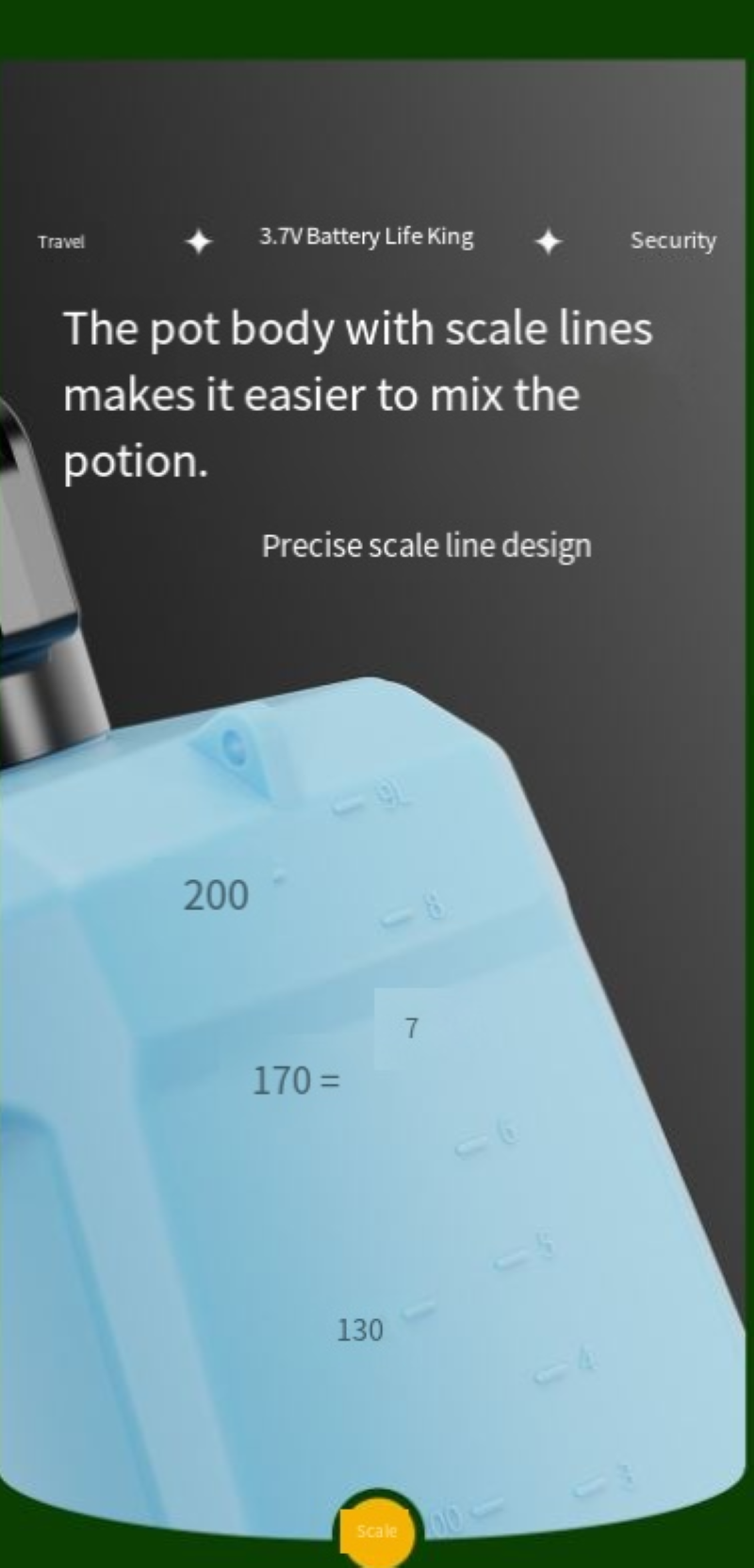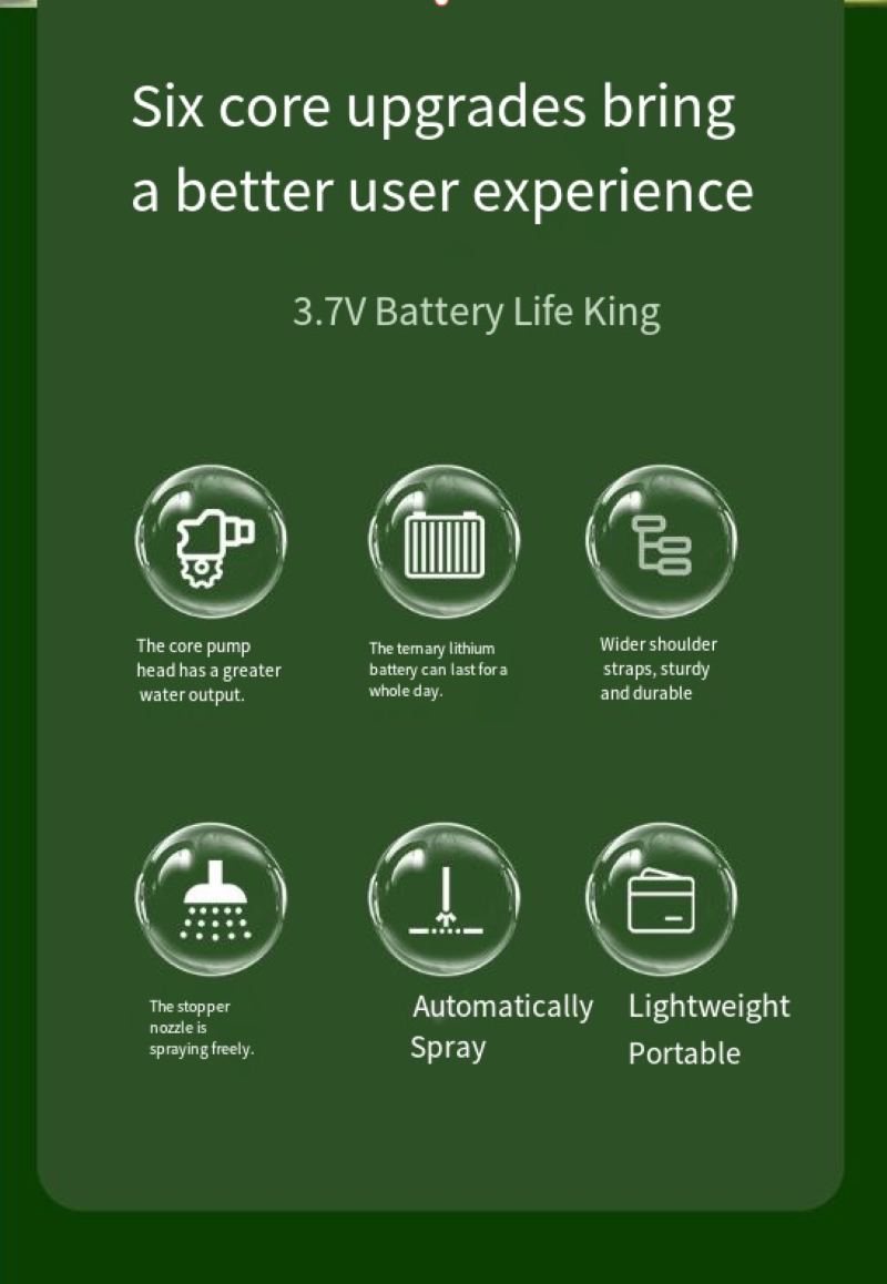 Em termos de potência, é equipado com um sistema de bateria de lítio de 3,7 V, com forte resistência e pressão de pulverização suficiente. Quando no modo de pulverização automática, a névoa fina e uniforme de alta pressão pulveriza continuamente, cobrindo uma ampla área e aderindo fortemente. Por exemplo, ao aplicar pesticidas em árvores, o líquido pesticida pode aderir uniformemente aos galhos e folhas, resultando em melhor controle de pragas e efeitos de fertilização; Ao regar flores e plantas, o fluxo de água semelhante a uma névoa é suave e não prejudica as plantas.