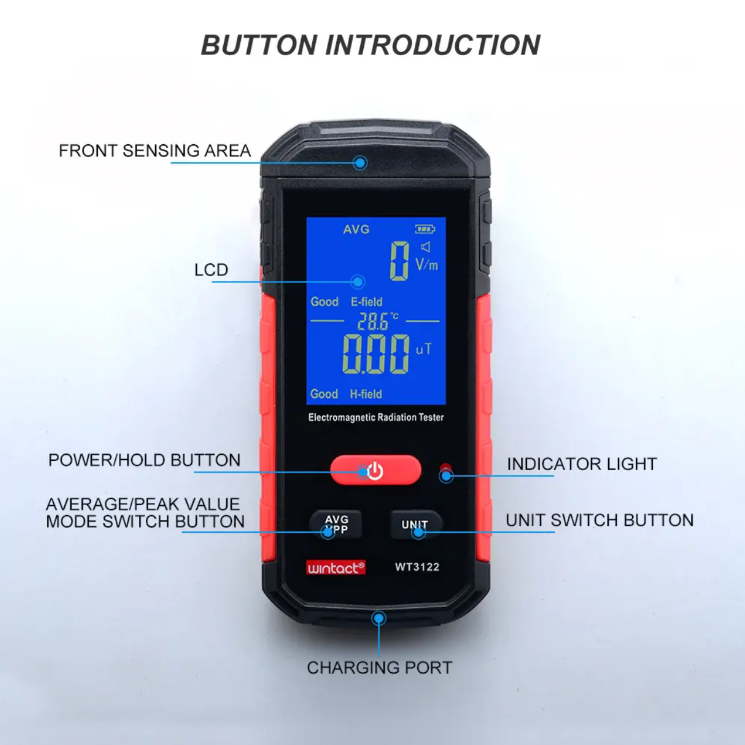 Electromagnetic radiation (mobile phones, computers, routers, microwave ovens, etc.): Detection range 0.01 - 1999 μT, resolution 0.01 μT, capable of accurately capturing radiation fluctuations during the operation of electronic devices, such as the radiation peak during phone calls and the radiation distribution around the router;